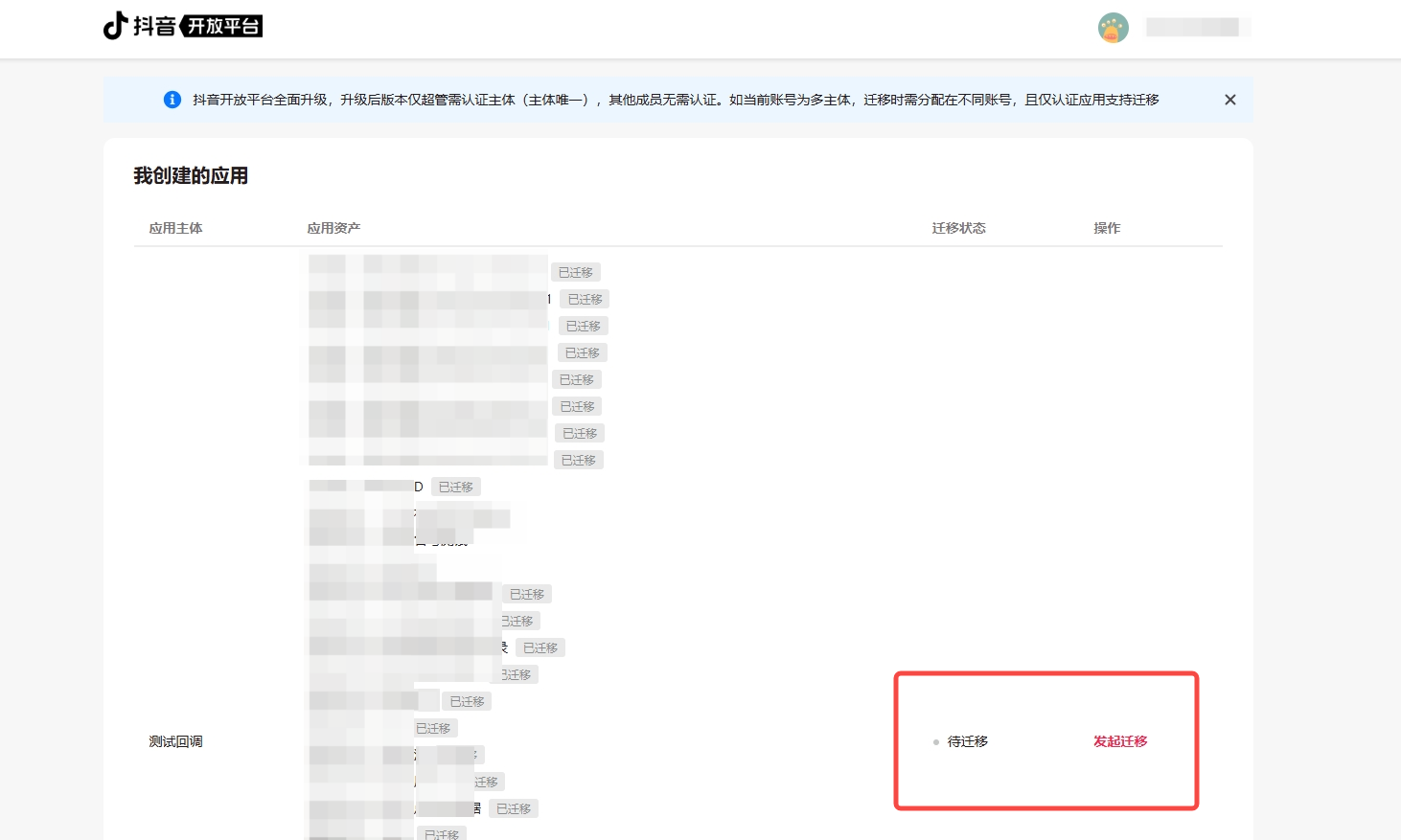 注意:如旧抖音开放平台注册账号主体与发布的小程序主体存在不一致情况,小程序迁移时将保持和小程序发布时认证的主体一致;如旧抖音开放平台多个小程序存在不同主体,将迁移至新平台多个不同账号。