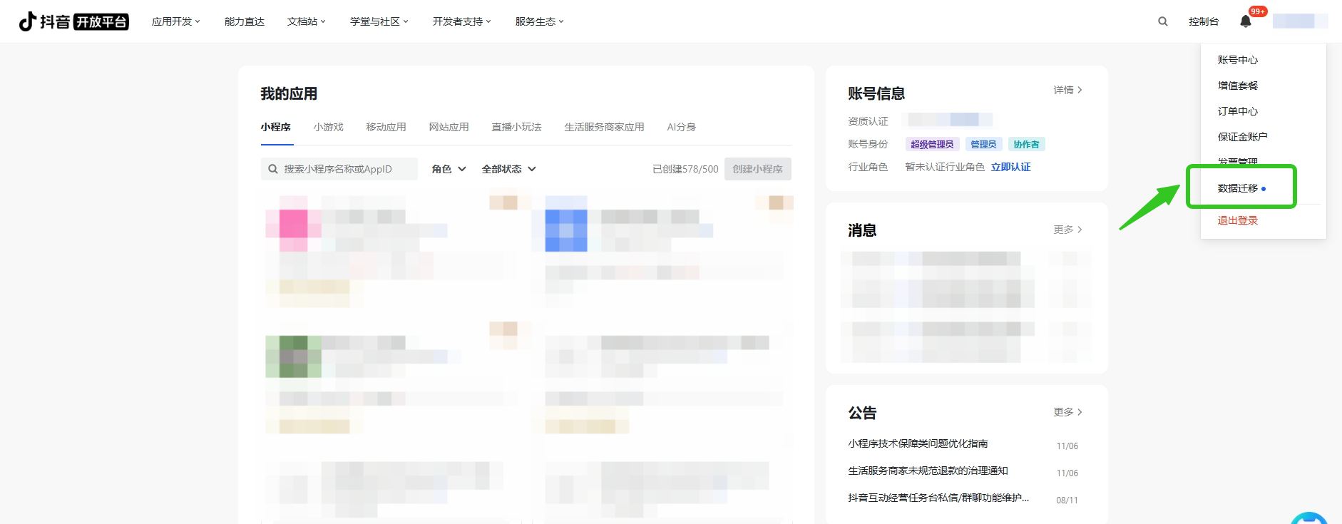 - •原平台为「字节小程序平台」(https://microapp.bytedance.com/),身份为「开发者」,账号数据将迁移至新抖音开放平台(https://developer.open-douyin.com/)