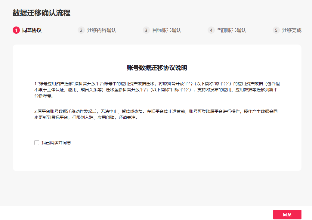 - 4.同意协议,注意需查看并同意相关数据迁移协议才可进行后续步骤。