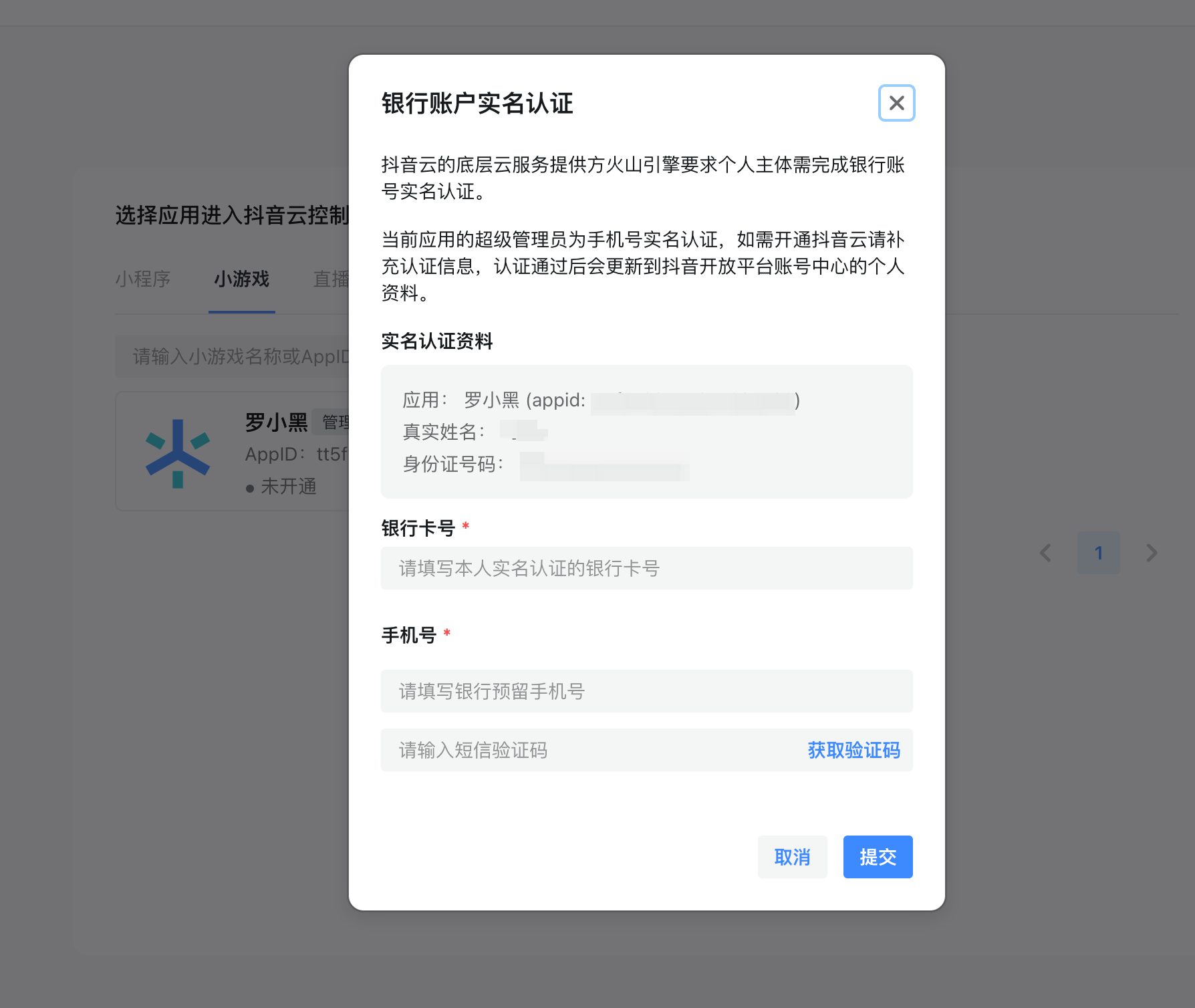 1.实名认证补充:若抖音开放平台仅完成三要素认证(身份证 + 姓名 + 手机号),入驻抖音云时需补充银行账号实名认证(需超级管理员操作,管理员 / 协作者无权限)。