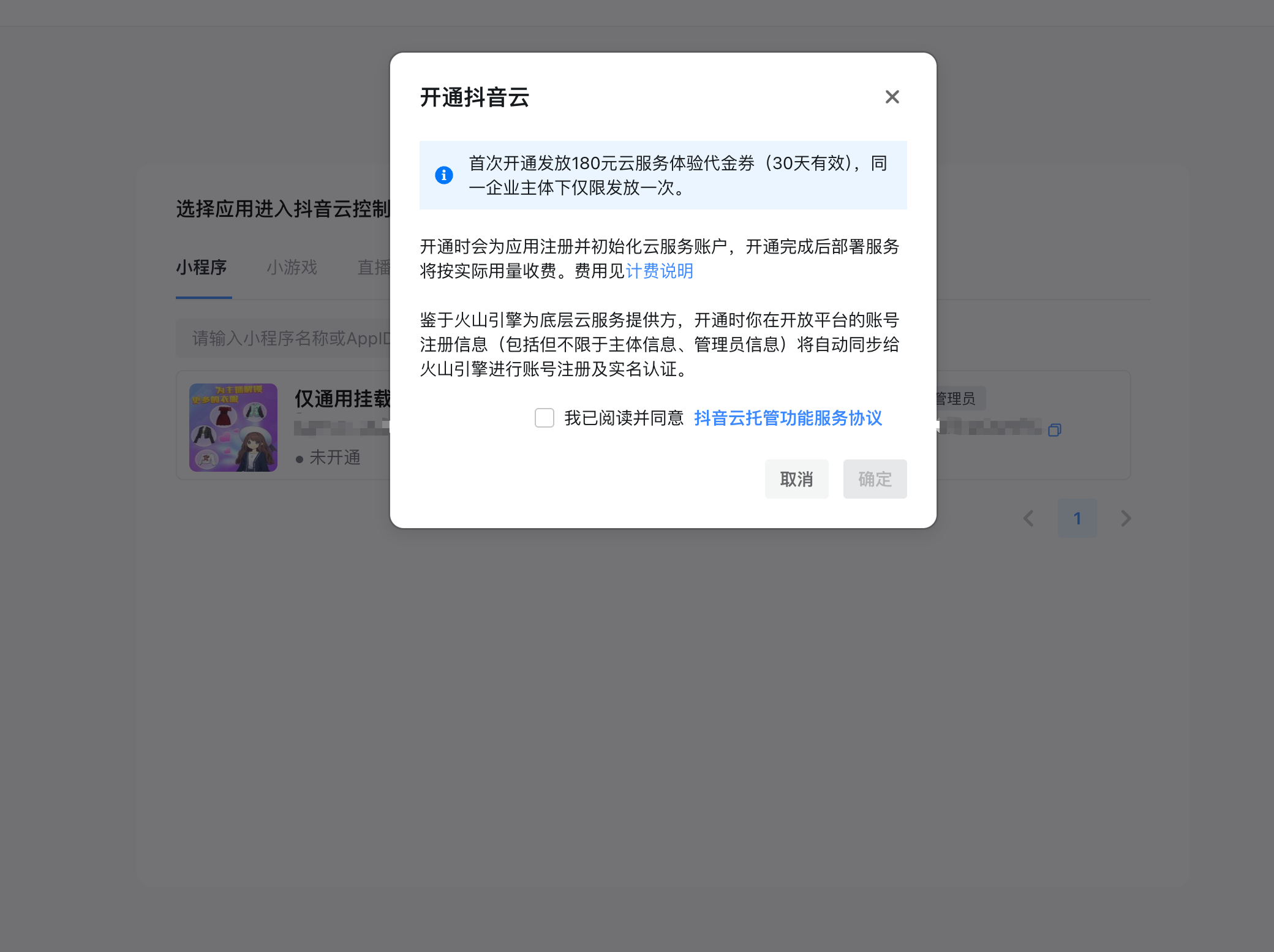 3.开通应用:找到状态为「未开通」的应用,点击后弹出「开通抖音云」弹窗,勾选《抖音云服务协议》并确认,开通流程预计 1-3 分钟完成。