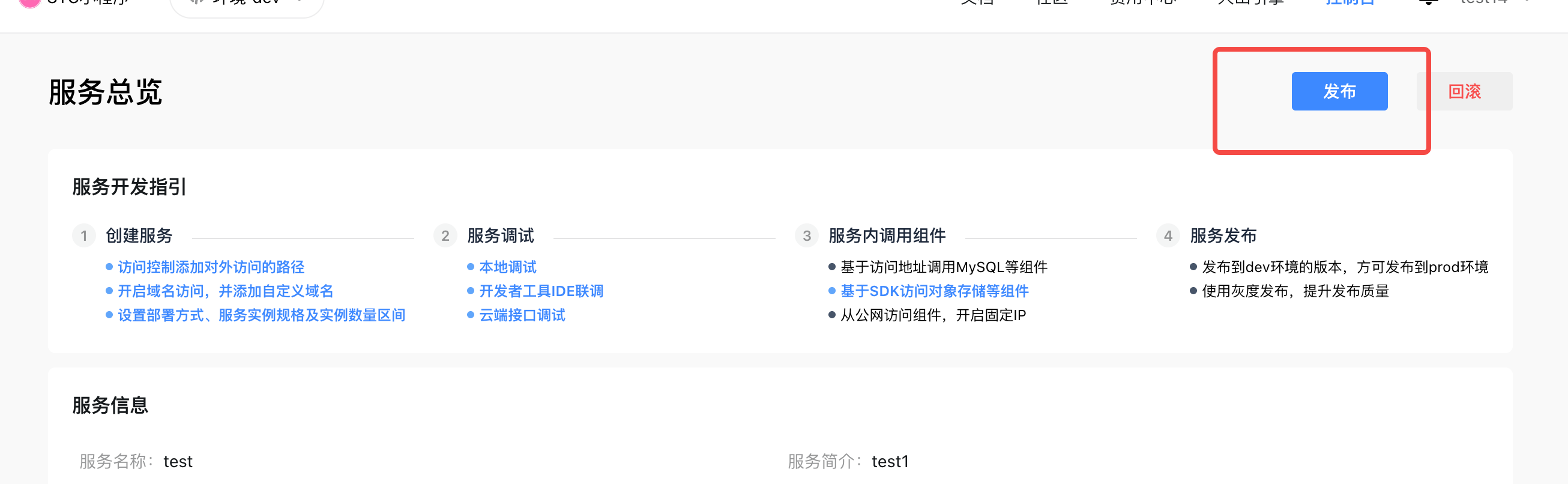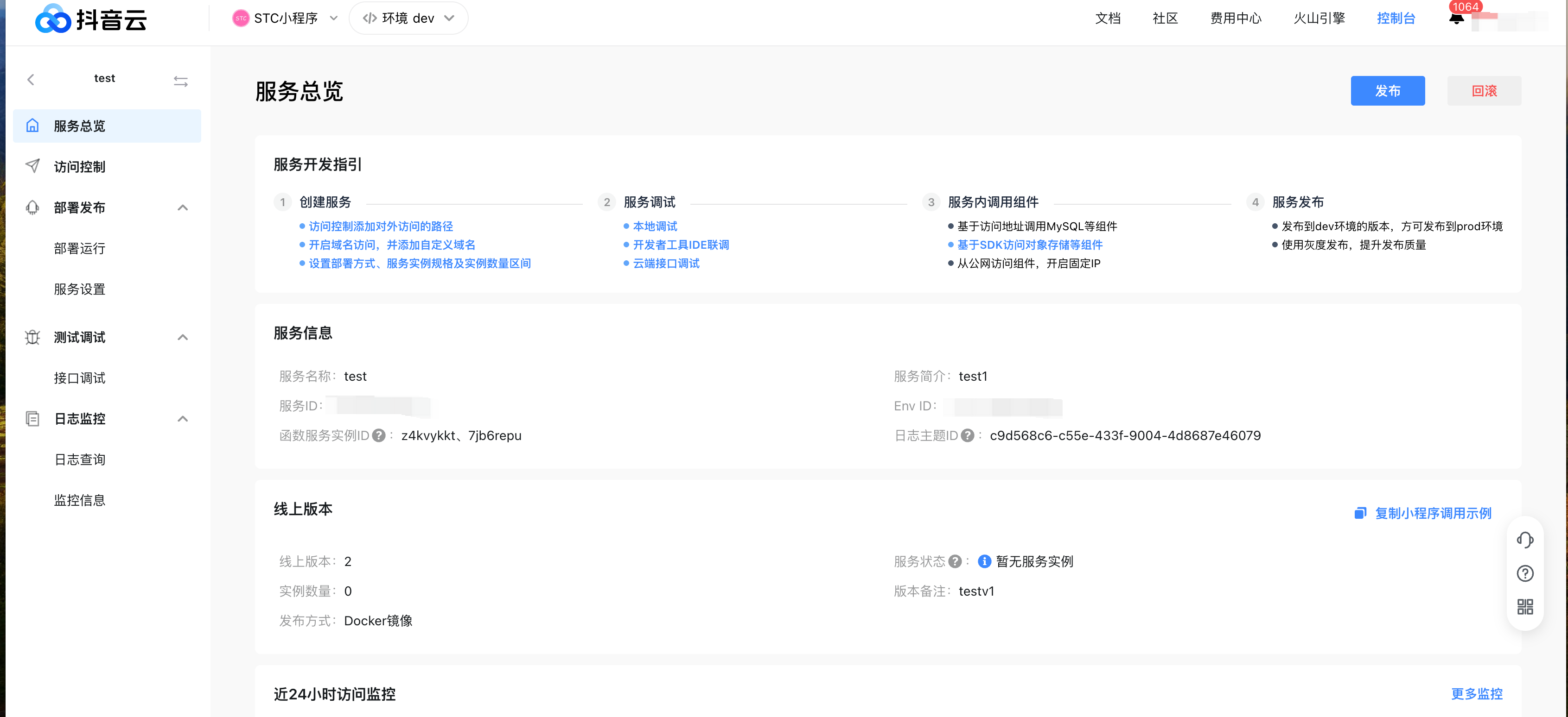 可在小程序代码侧通过 callContainer api 访问已部署的服务,对应 serviceID 和 envID 替换为已经部署的抖音云服务。