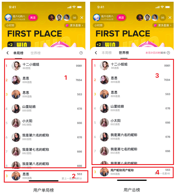 1.第 1 部分 和 第 3 部分是榜单区域,目前限制榜单长度最多展示Top 150的用户数据,当然也可以低于 150,取决于上报的榜单列表长度。