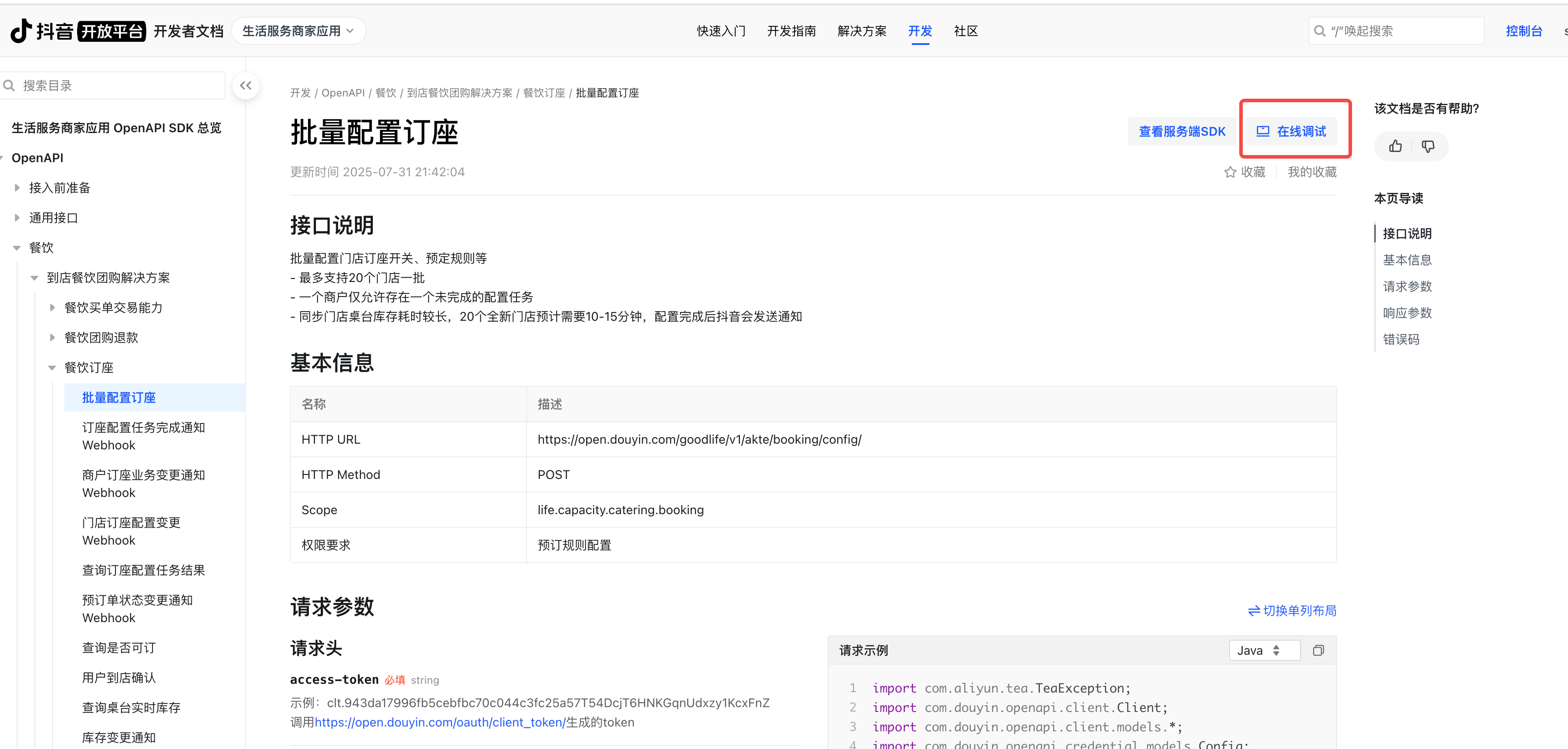 开发者可以在OpenAPI对应的接口文档右上角,点击按钮“在线调试”进入调试台