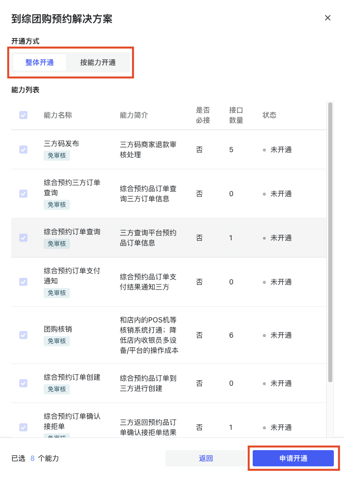 第四步:选择“整体开通”或“按能力开通”后,点击「申请开通」按钮开通解决方案能力权限。