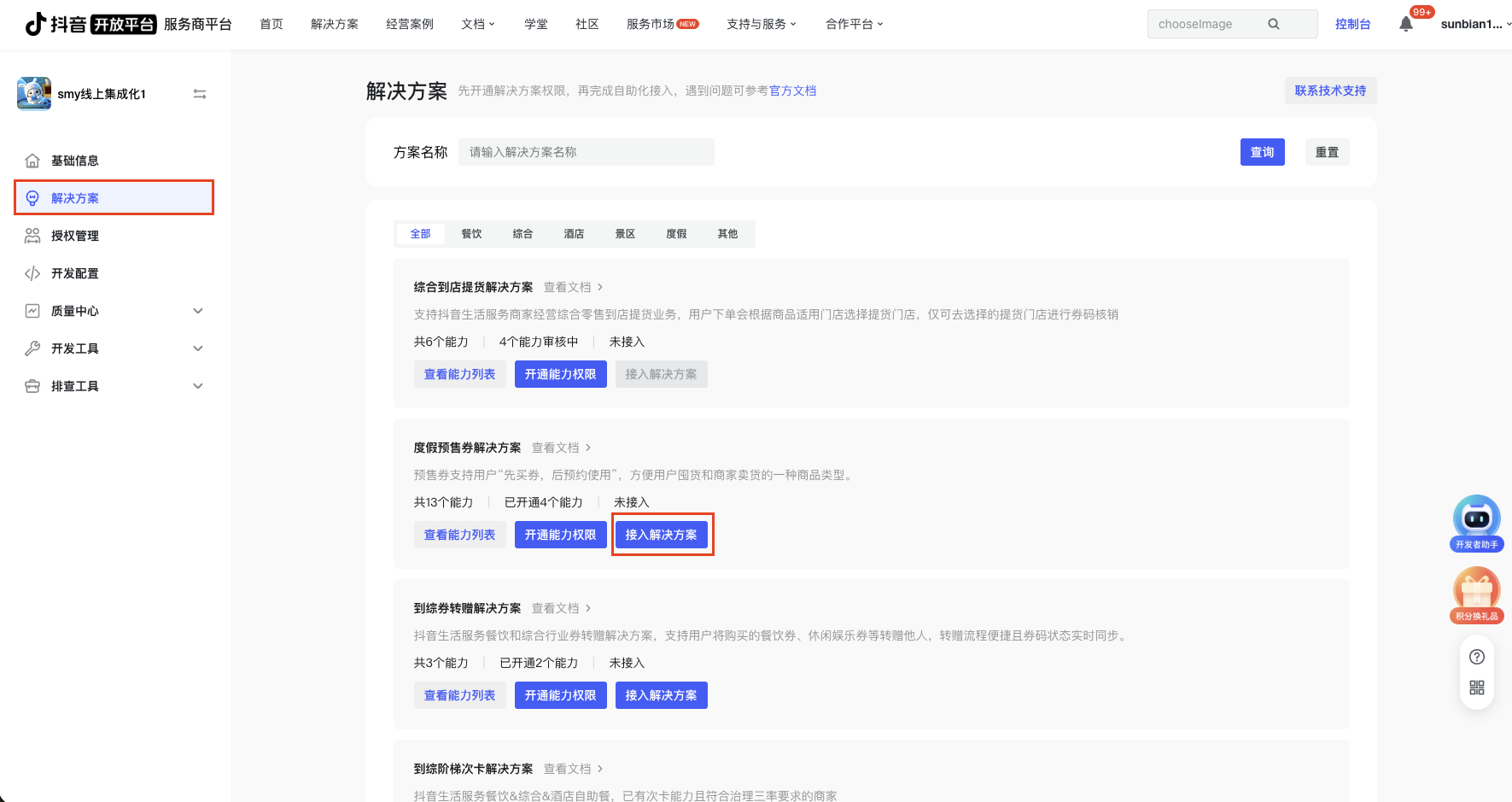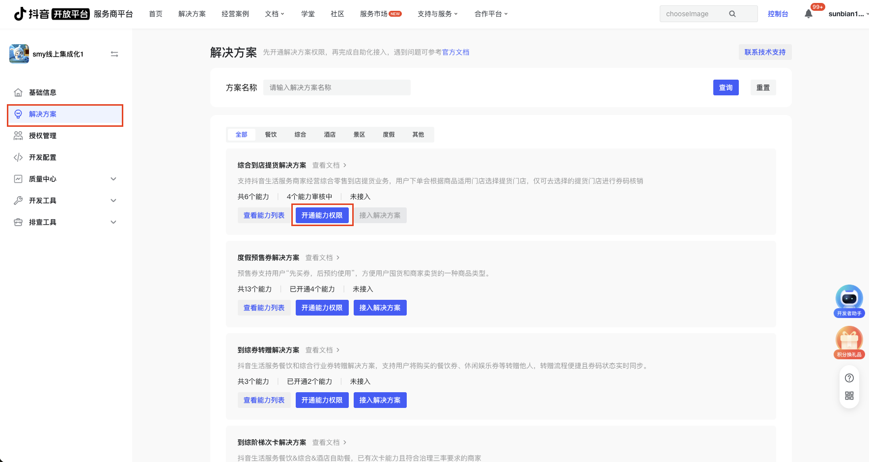 第三步:在应用详情页的左侧导航栏选中解决方案,找到本次需要对接的解决方案,点击「开通能力权限」按钮打开弹窗。