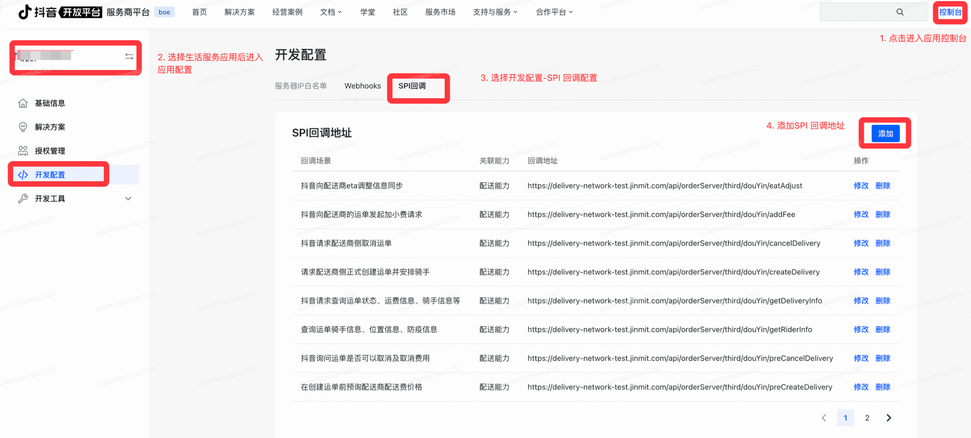 前置条件:进行SPI回调配置,配置路径:登录抖音开放平台,控制台-生活服务商家应用-开发配置-SPI回调