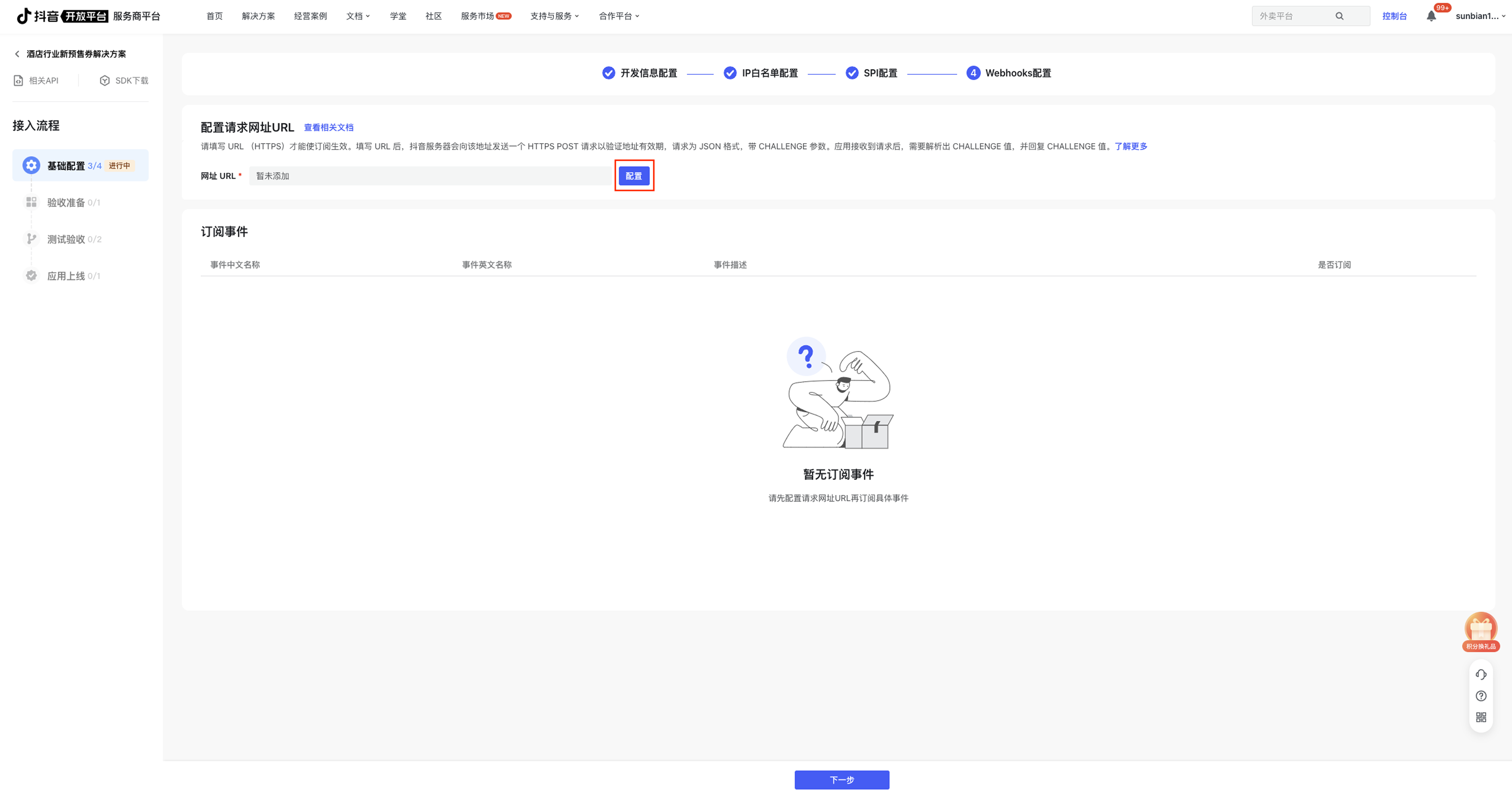 第一步:在解决方案接入详情页左侧导航栏选中基础配置-Webhooks配置。