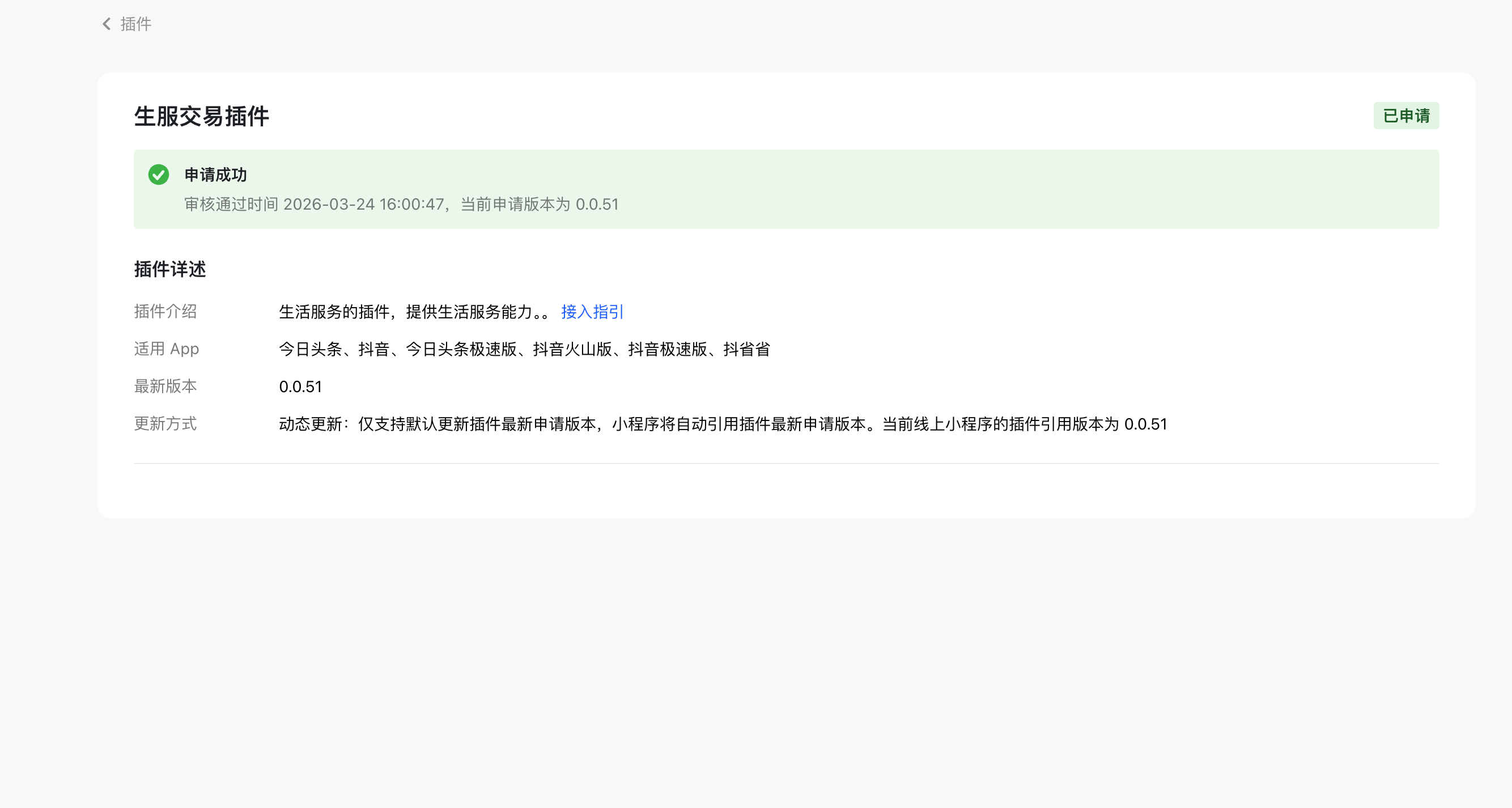 小程序开发者可以在「开发者运营平台-控制台-能力-插件」中查看已申请插件以及当前使用版本。