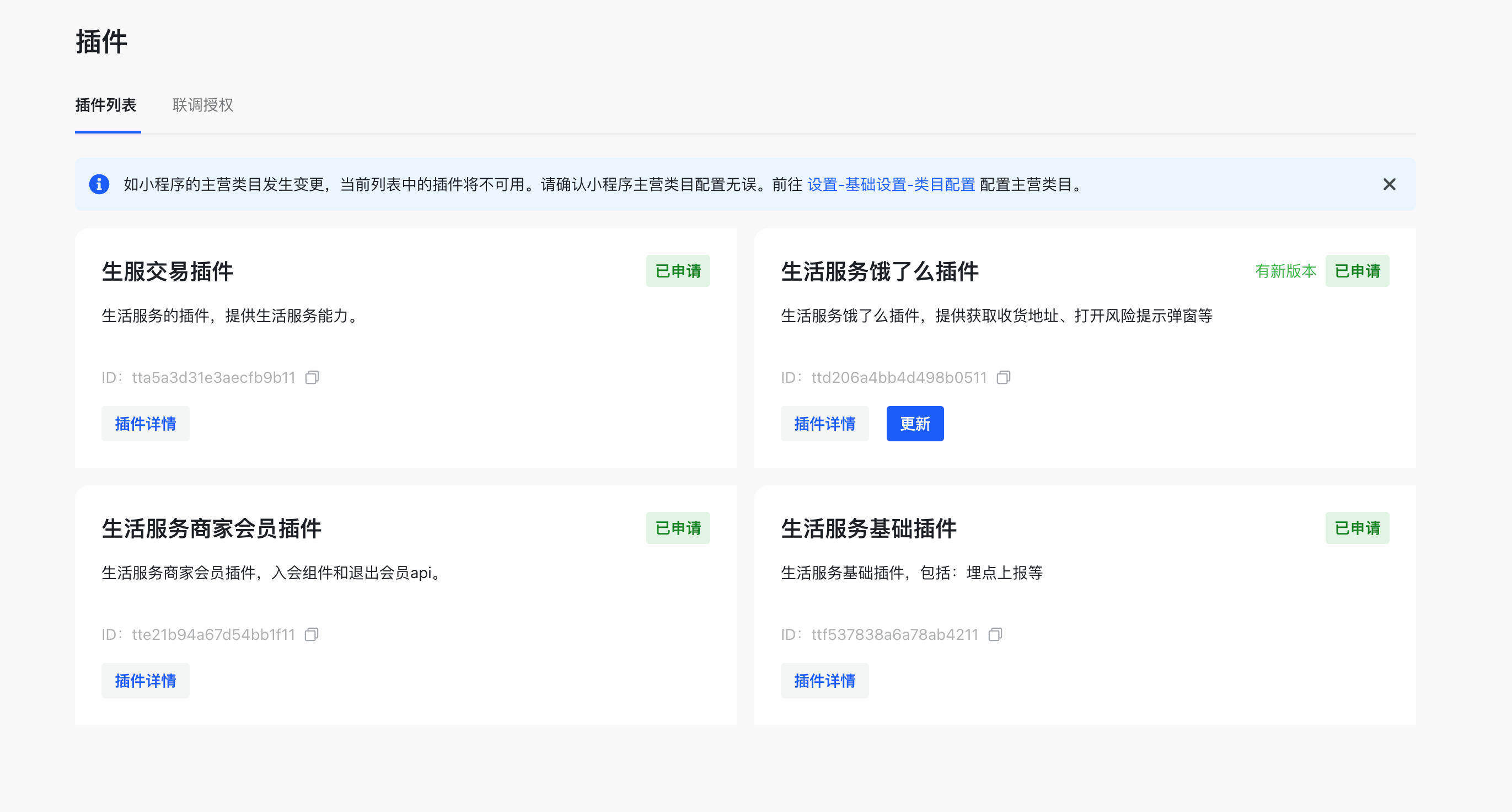 插件访问和申请的前提是小程序必须设置主营类目,根据小程序主营类目,可申请插件会存在差异。
