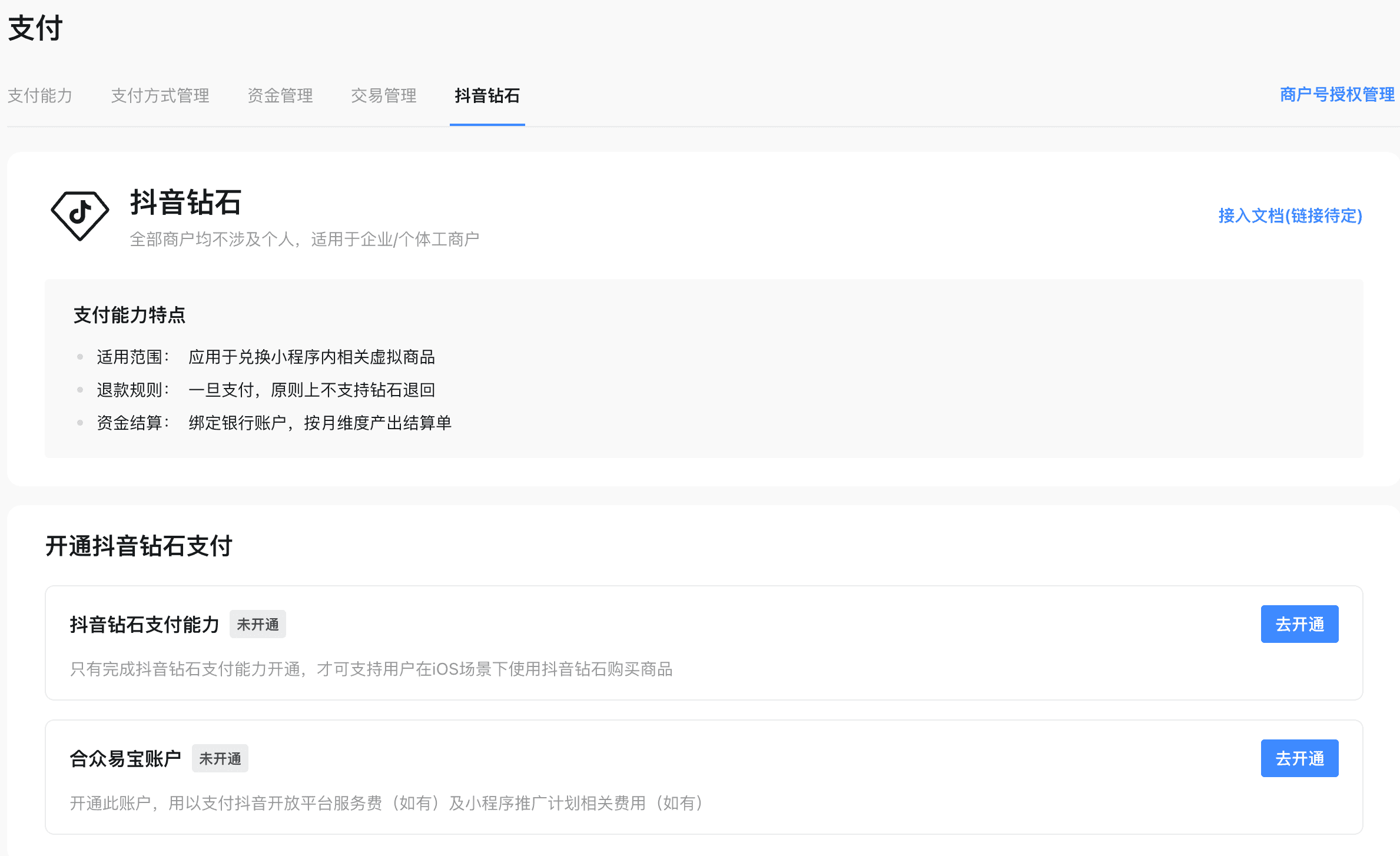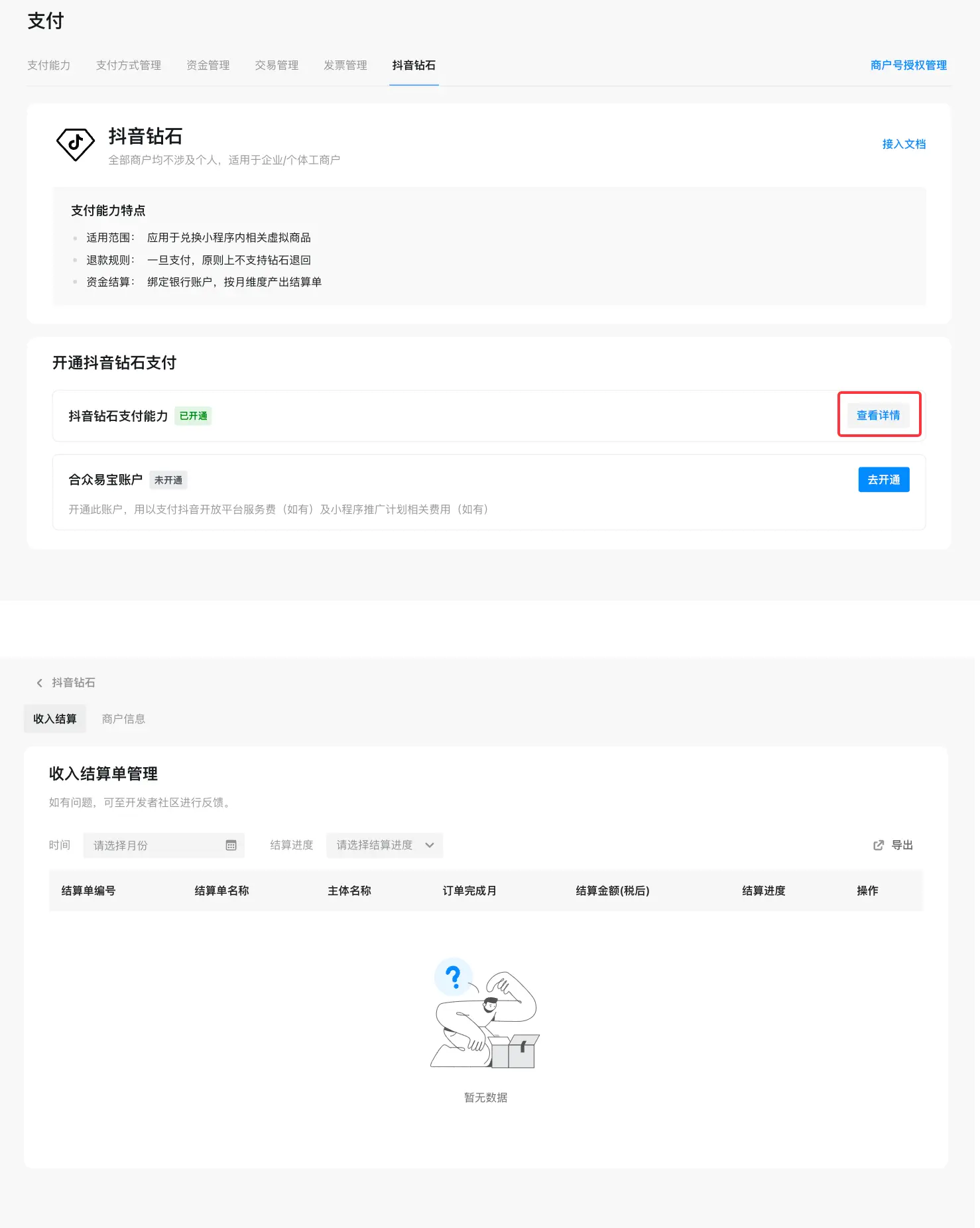路径:能力-支付-支付产品管理-抖音钻石-收入结算