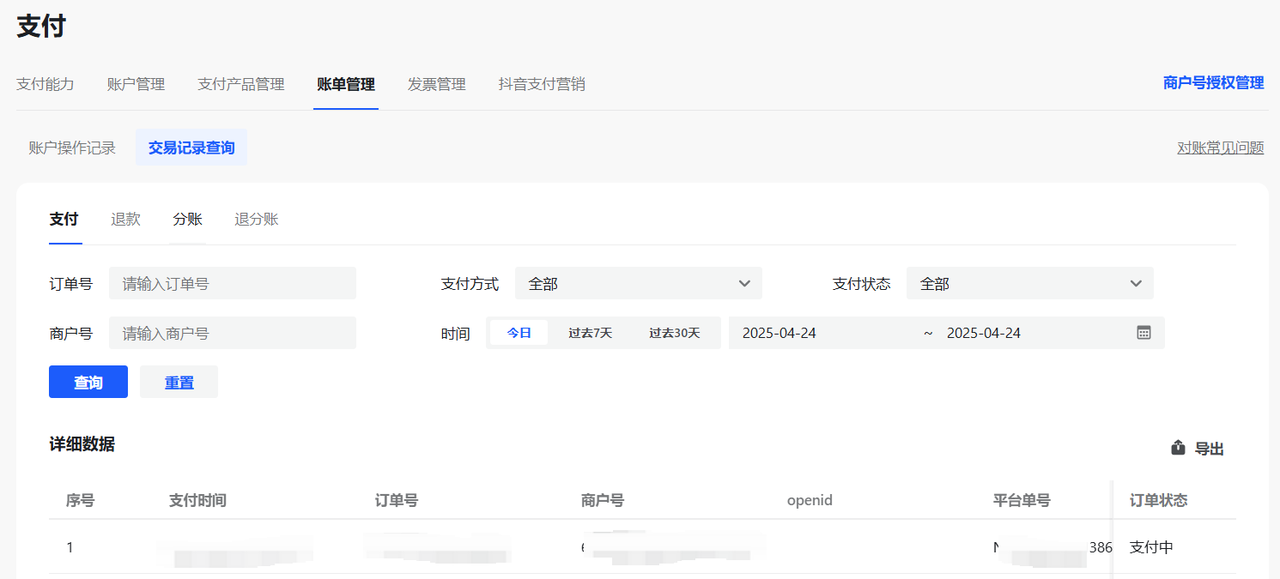 路径:支付-账单管理-交易记录查询 | 钻石支付交易数据产出:【时间周期:上月 20 日-本月 19 日】