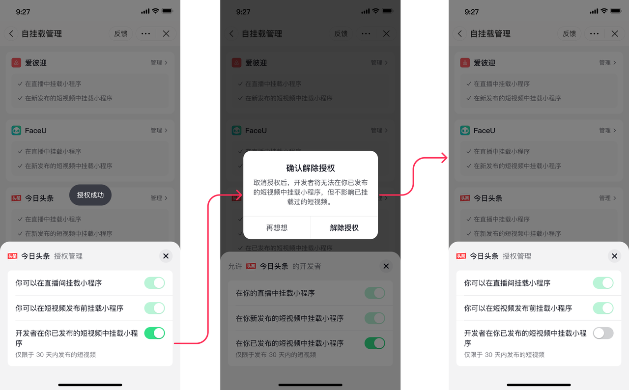 作者可通过小程序推广计划入口(图三),可查看已经绑定的小程序,并可增加/取消「给存量视频自动绑定小程序锚点」的授权 (图四增加)(图五取消),也可通过抖音授权管理入口关闭授权。