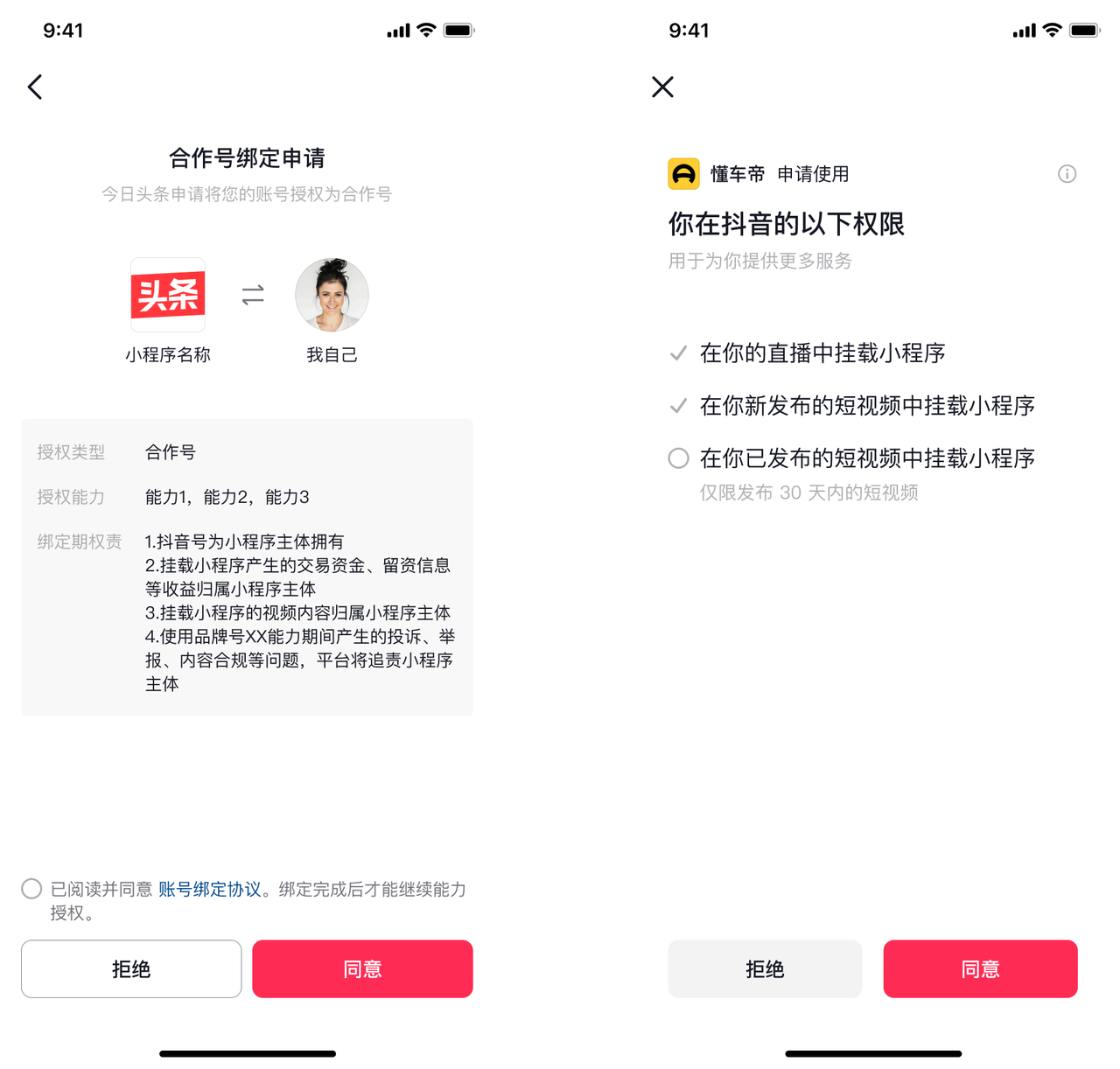 同时在开发者发起账号绑定申请后,作者可在抖音端收到通知或开发者完成添加能力动作后,同样作者在抖音端可收到消息。