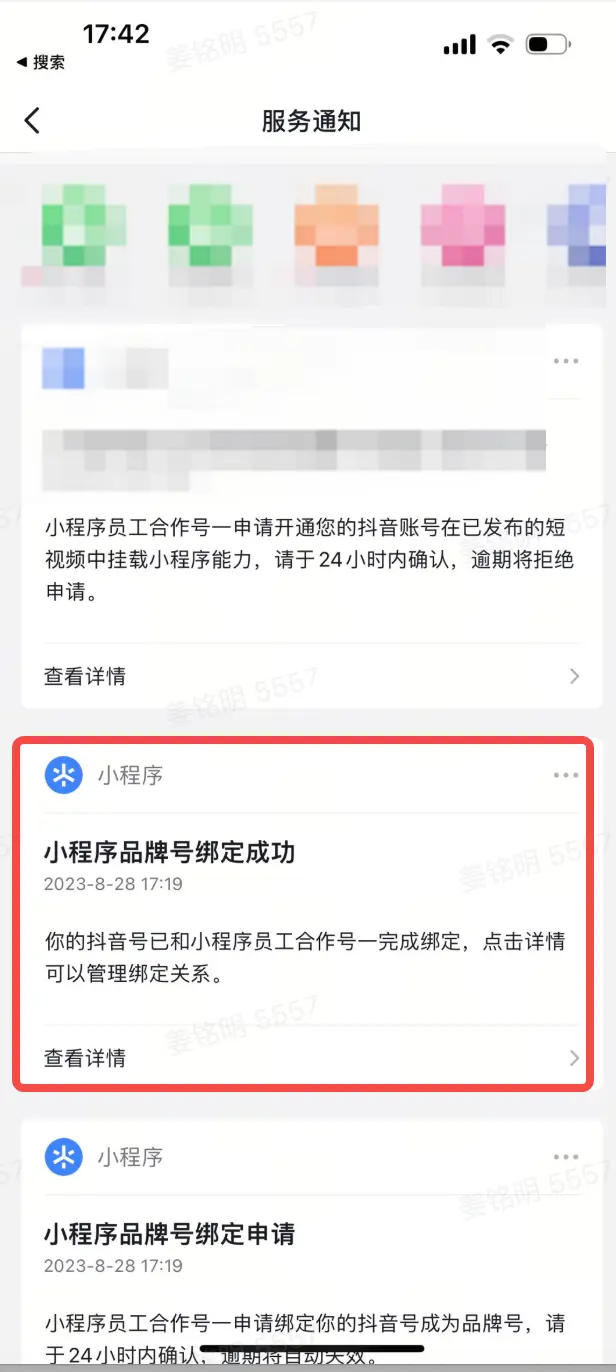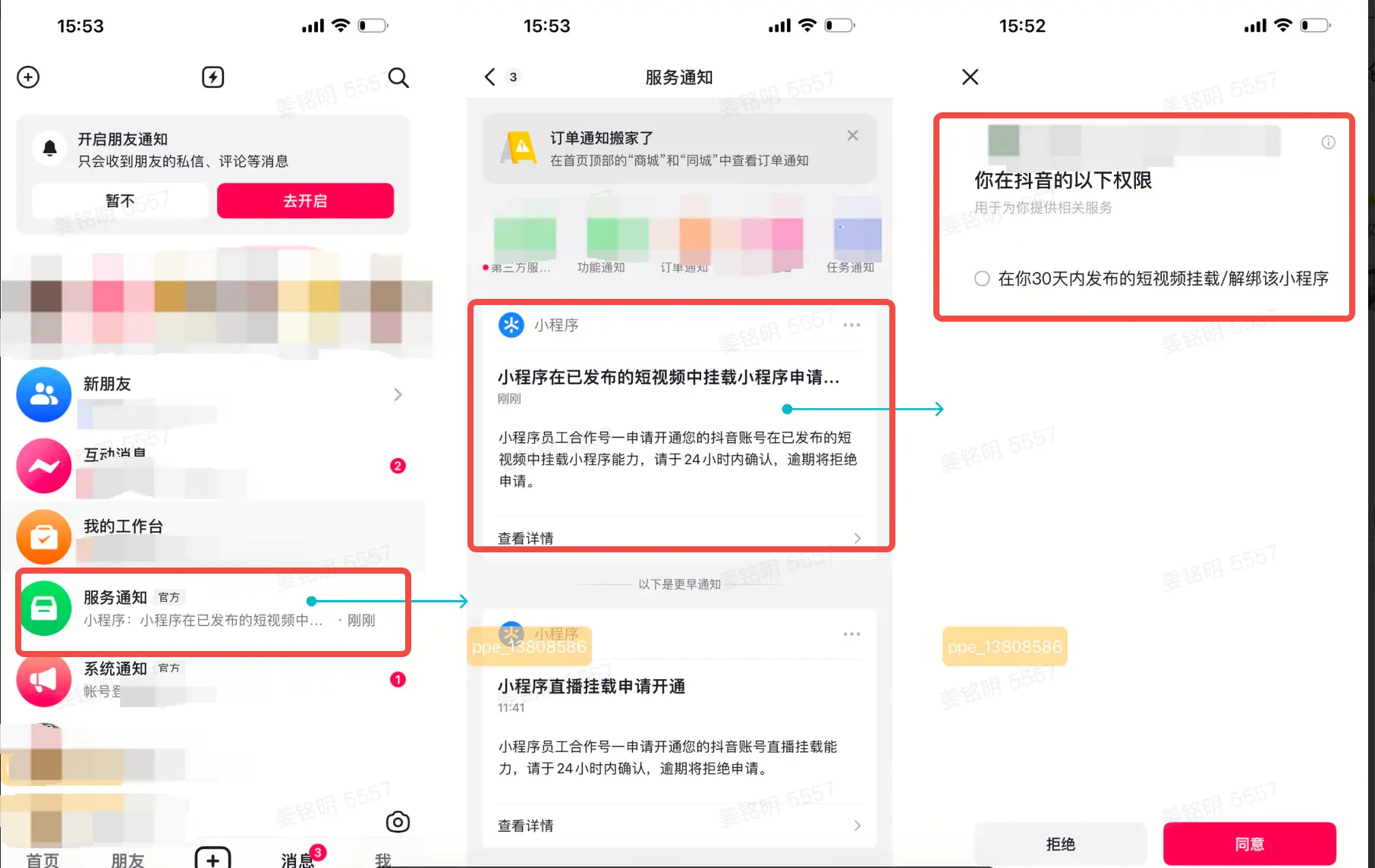 在「抖音 -> 消息 -> 服务通知」查看新增能力的授权通知。