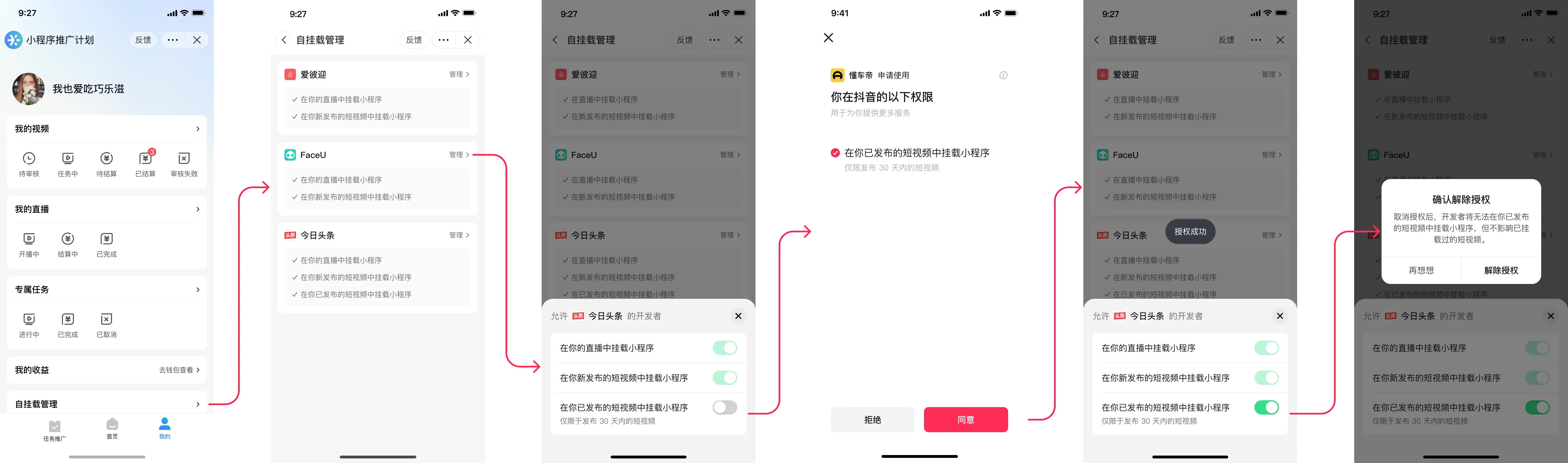 作者通过抖音端搜索小程序推广计划 -> 我的 -> 自挂载管理,查看已经绑定的小程序并进行对应能力的授权管理。
