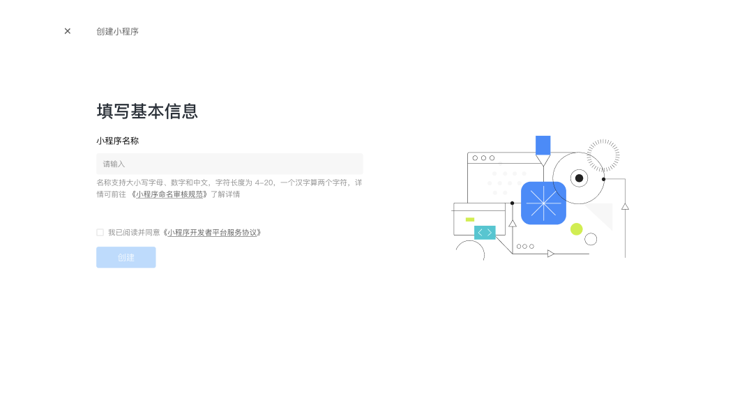小程序创建前需确保已完成主体入驻,流程详见:入驻开发者平台