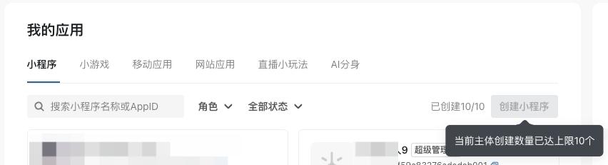 平台以主体维度进行小程序创建数统计,而非超管账号,你的企业主体下总共已有10个小程序(即该主体下所有超管账号创建小程序数已满10个,如图1);