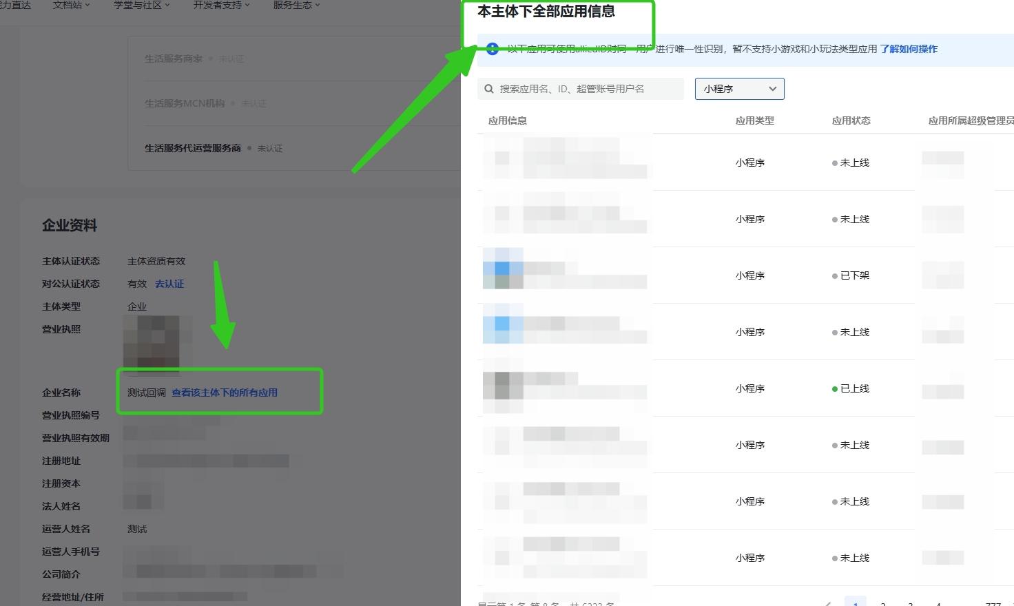 在【账号中心】-【企业资料】-【企业名称】处点击可以查看该主体下所有应用(如图2)