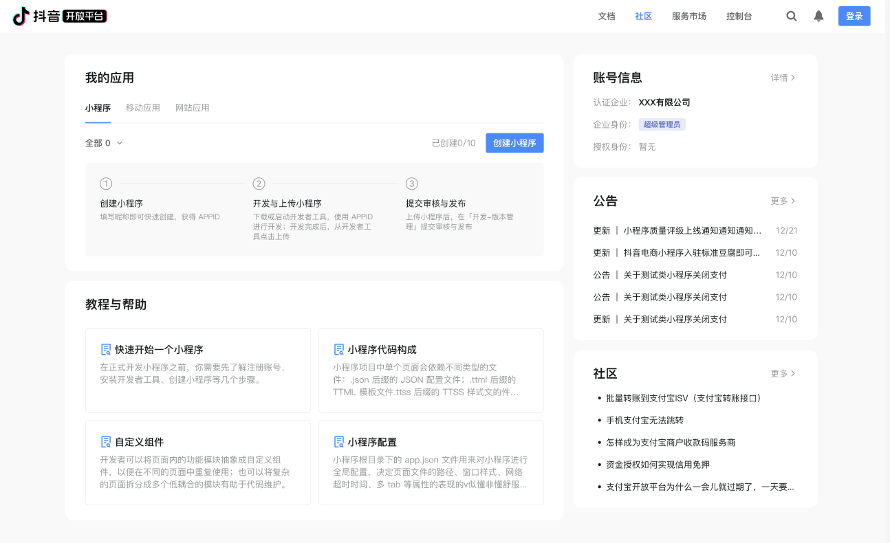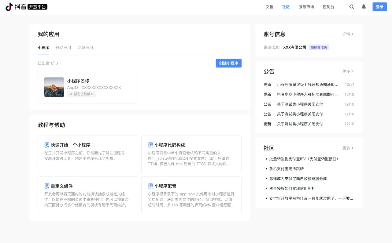 - 3.小程序创建后,由抖音开放平台进行审核。审核通过后,控制台会展示新建的小程序。