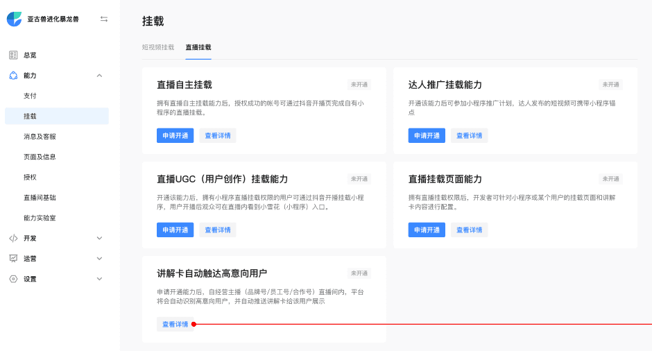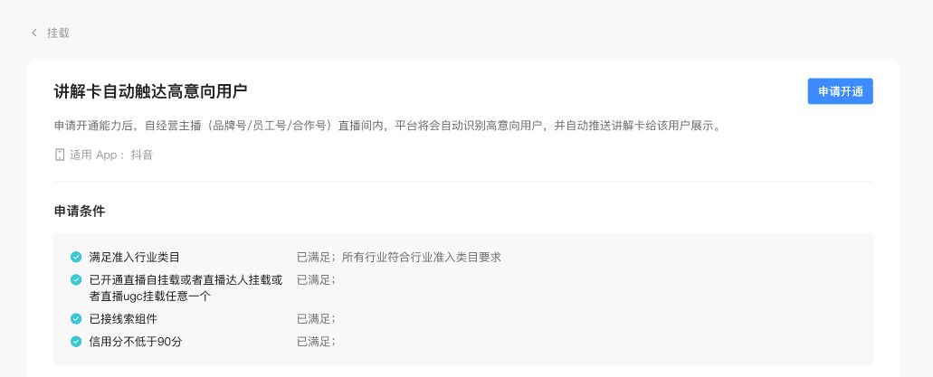 选择【挂载-直播挂载-讲解卡自动触达高意向用户】打开申请页面,如申请条件均满足,点击【申请开通】,审核通过后会开通该能力。