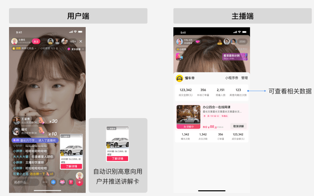 小程序申请开通后,自经营主播(品牌号/员工号/合作号)开播后,若主播正在讲解的页面有使用线索组件,平台将会自动识别直播间内高意向用户,并自动推送讲解卡给该用户展示,提高用户留资的效率。