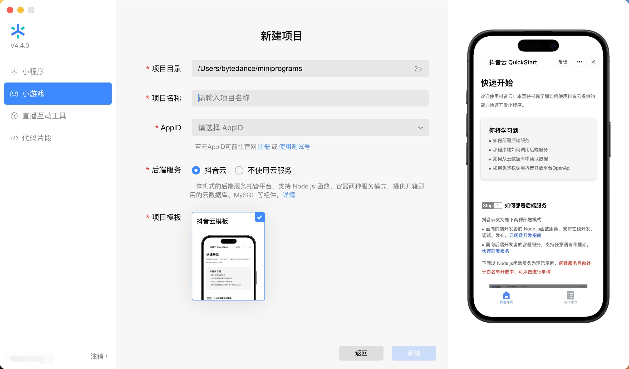 在创建项目时,将后端服务勾选为抖音云,点击「新建」即可直接创建抖音云项目。