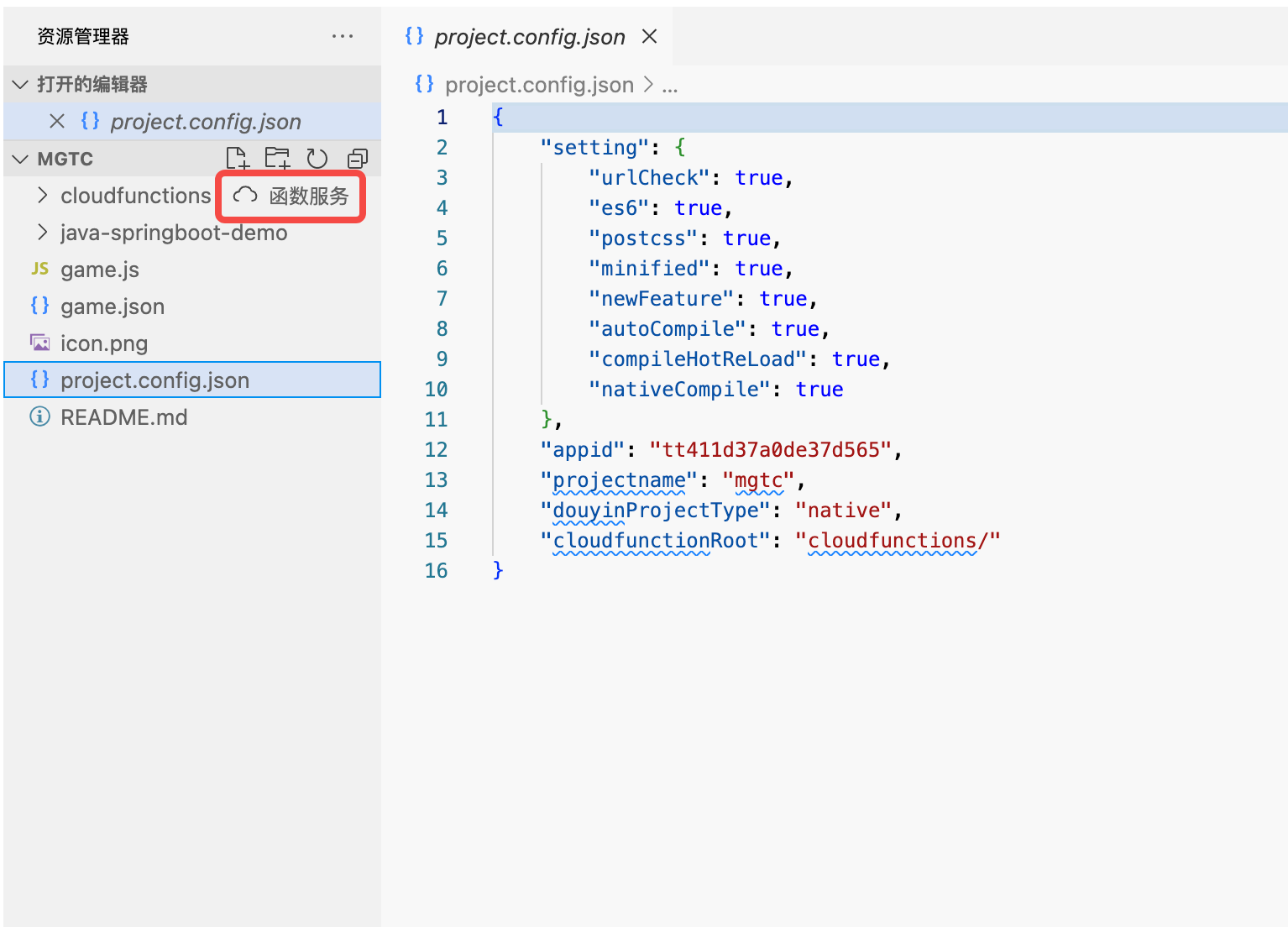 当抖音云项目创建完成后,资源管理器中相应目录名称后会新增「函数服务」标记,该目录为抖音云函数的存放位置。