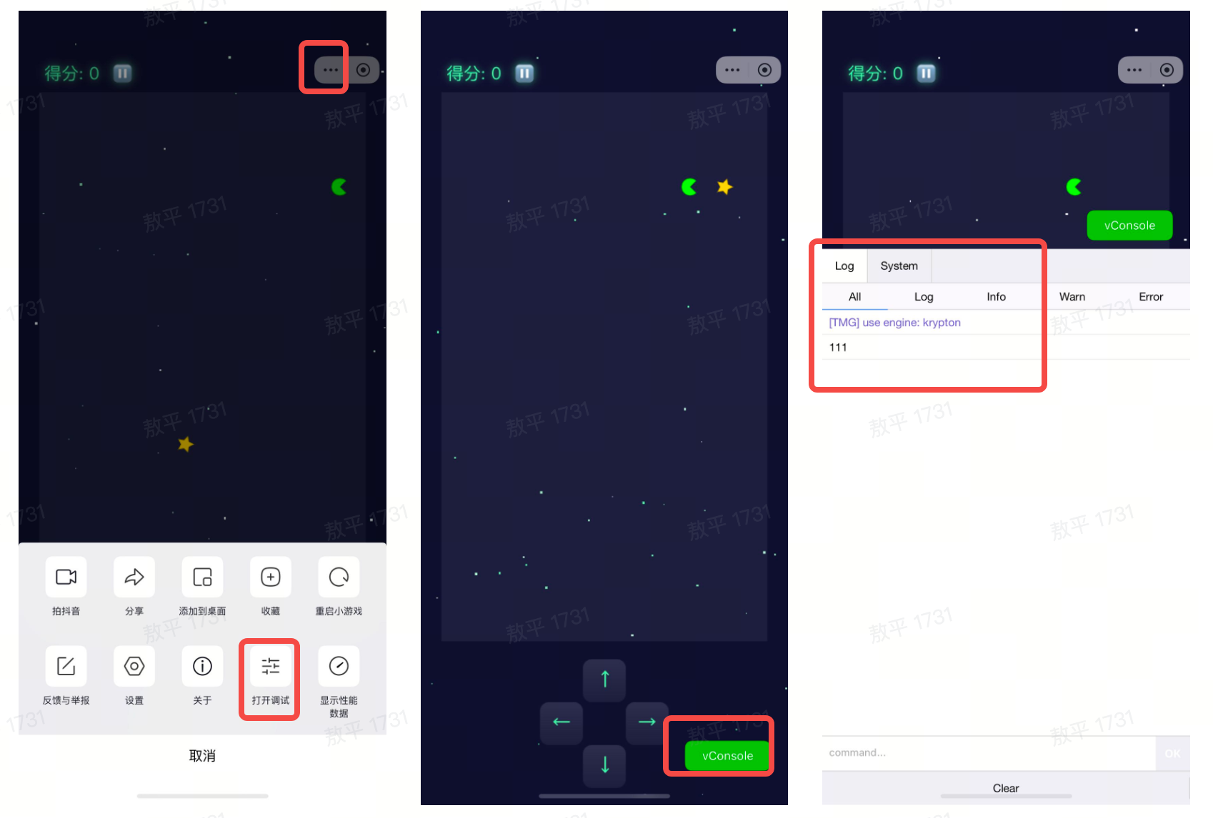 若需要查看控制台 Console 日志,打开小游戏后,在右上角点击【...】,点击【打开调试】,点击 vConsole,即可查看相关日志。