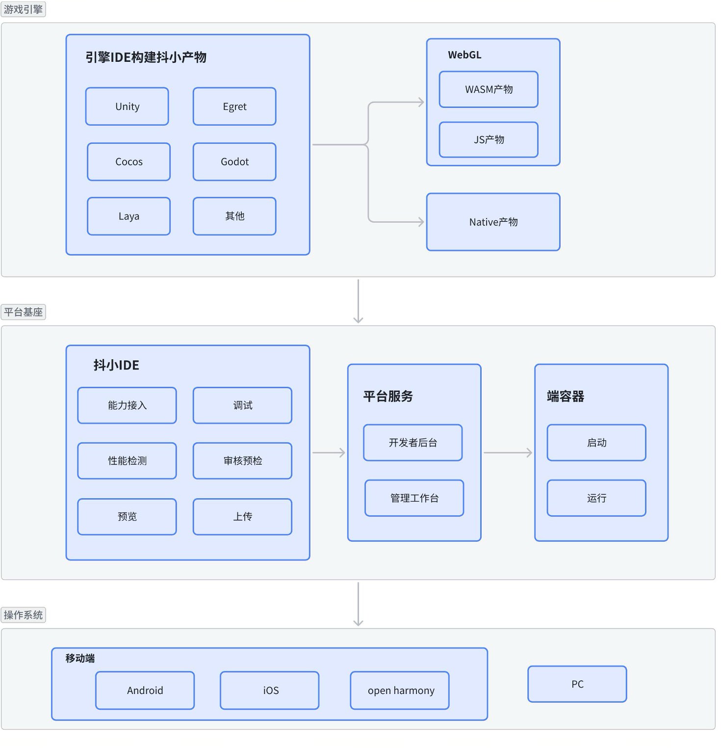 抖音小游戏平台面向多样化的游戏开发需求,构建了统一的小游戏运行与发布体系,支持开发者使用不同游戏引擎或技术方案进行开发,并以一致的平台能力完成构建、发布与运行。