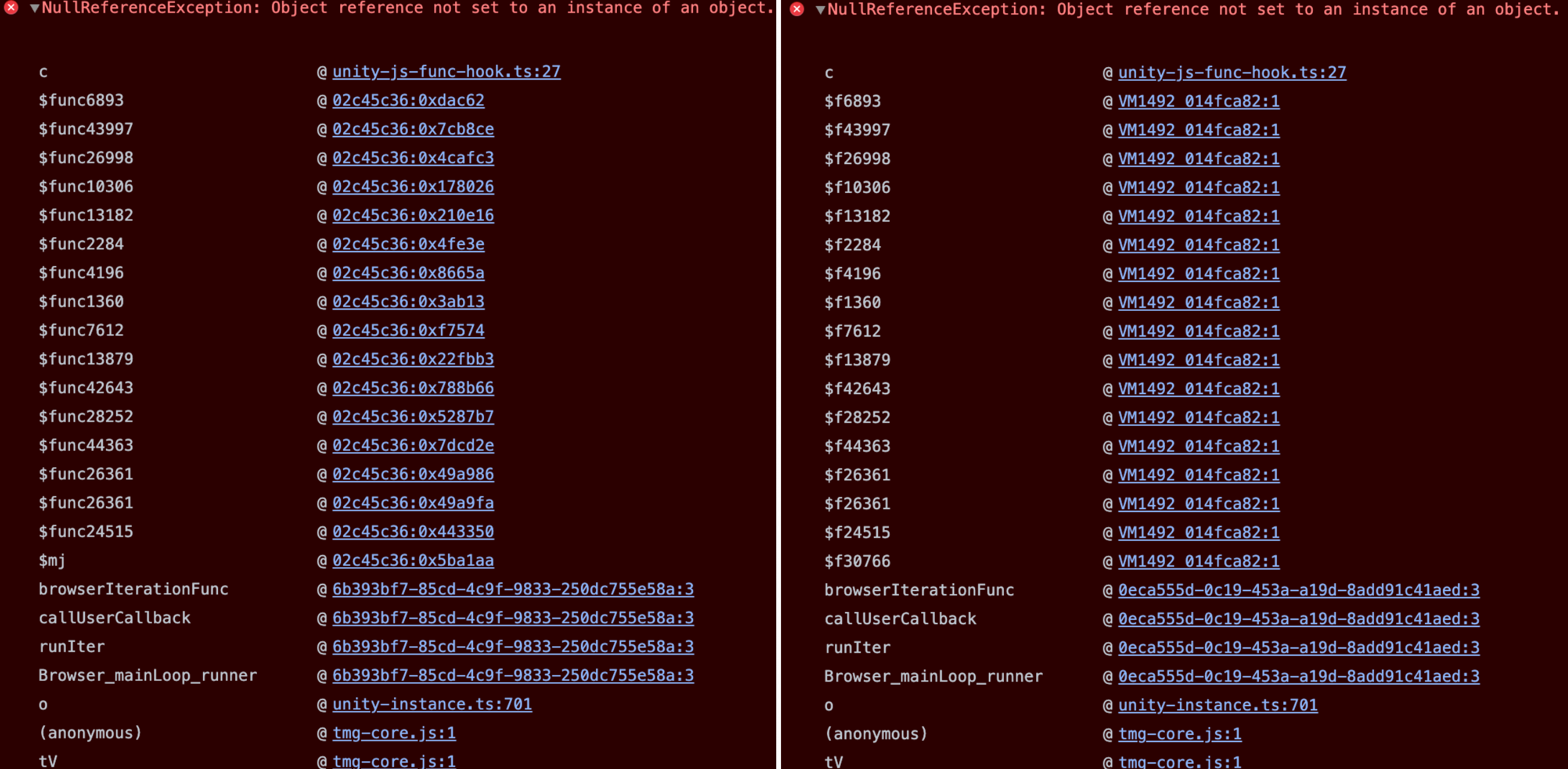 相比于 release 包,debug 包会将原始函数 ID 作为函数名打入分包后的 wasm 文件中。如图,左侧为分包前堆栈,右侧为分包后堆栈,可以看到分包后堆栈中显示为 “f + 函数 ID”,其中函数 ID 与原始函数 ID 相同,可查询符号表还原堆栈。