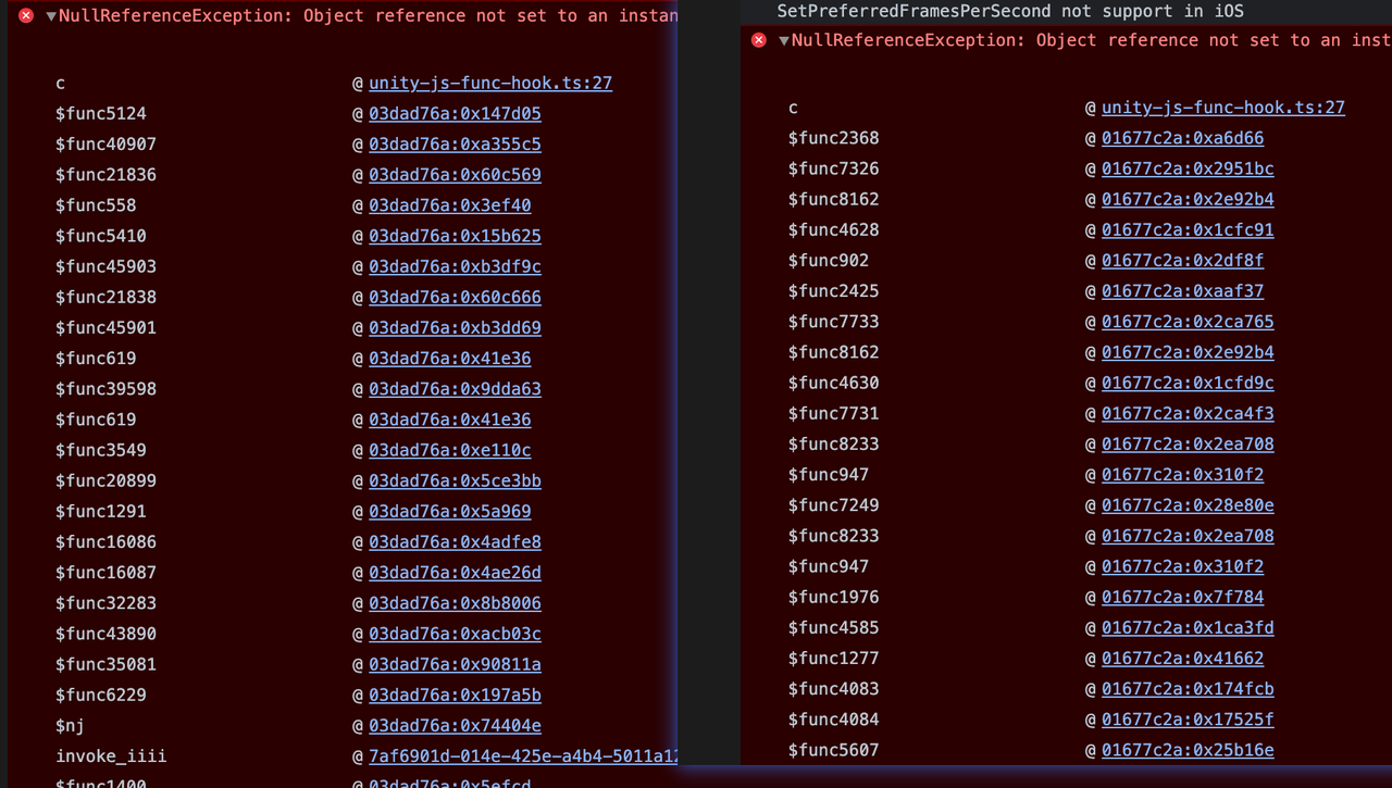 启用 wasm 分包后,由于原来的函数分散到了两个 wasm 文件内,堆栈中显示的函数 ID 会发生变化,无法使用原始的符号表文件还原堆栈。