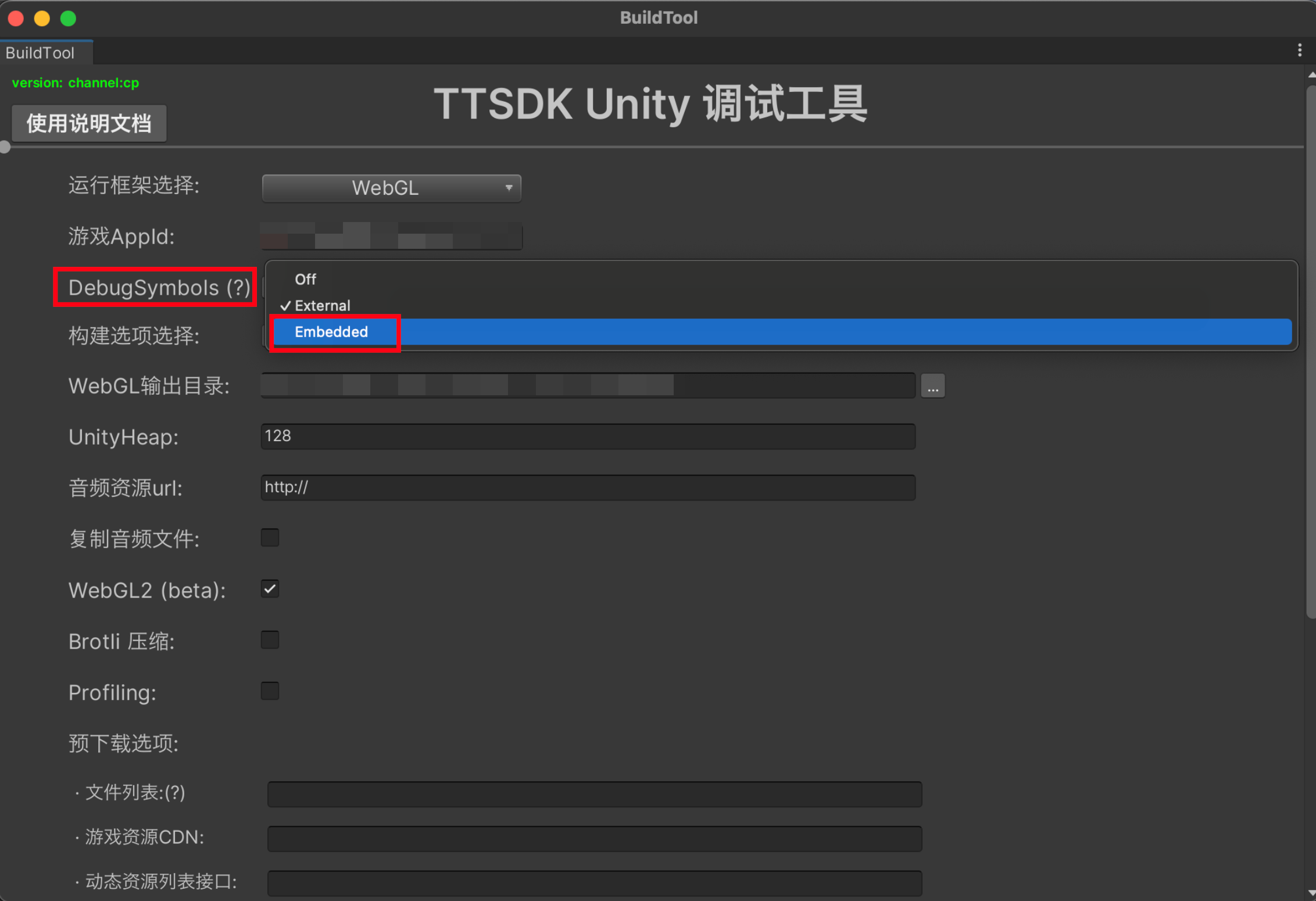 在 TTSDK 构建工具面板中,将 DebugSymbols 选项调整为 Embedded,此时 wasm 包体内将包含有函数名称