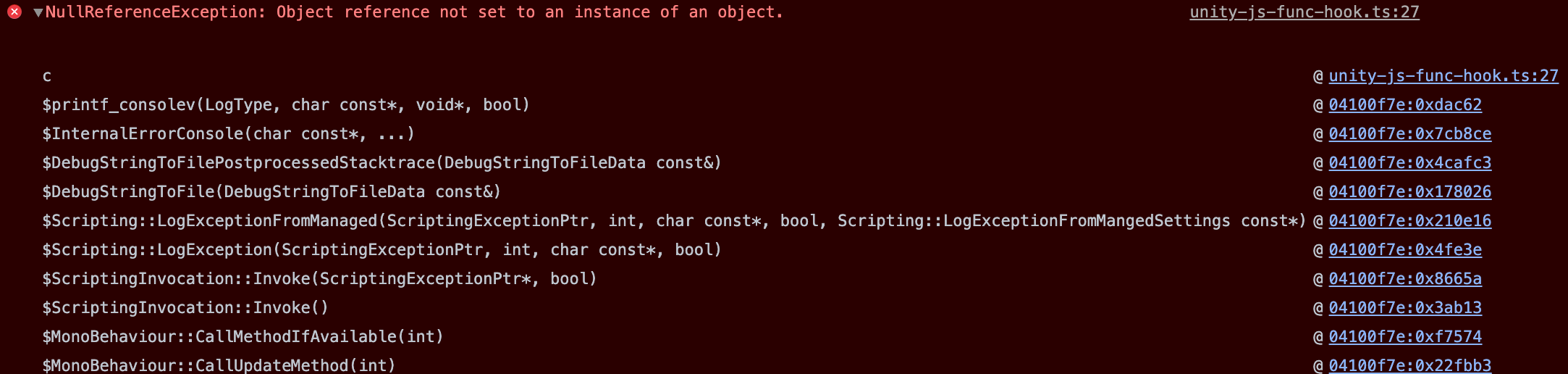 默认构建参数下(DebugSymbols 选项为 External 时),错误堆栈可能显示如下: