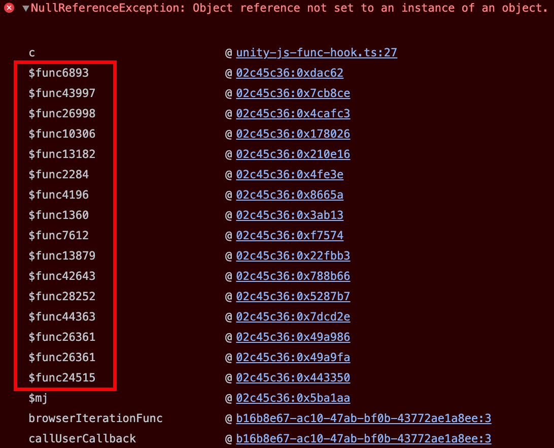 其中 wasm 函数显示为不可读的 “func + 函数 ID” ,在未启用 wasm 代码分包时,有两种方式获取原始堆栈信息: