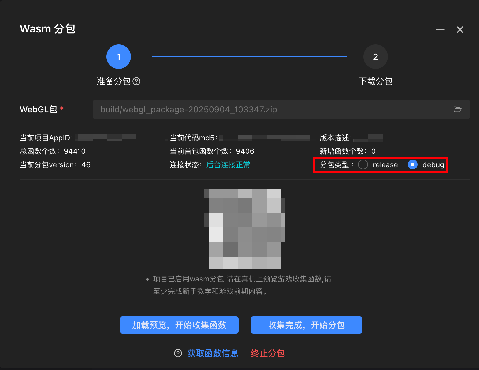 注意:使用 Embedded 选项后,wasm 包体体积将大幅上升,请勿在线上版本中使用。且此时由于没有符号表文件,无法开启分包。