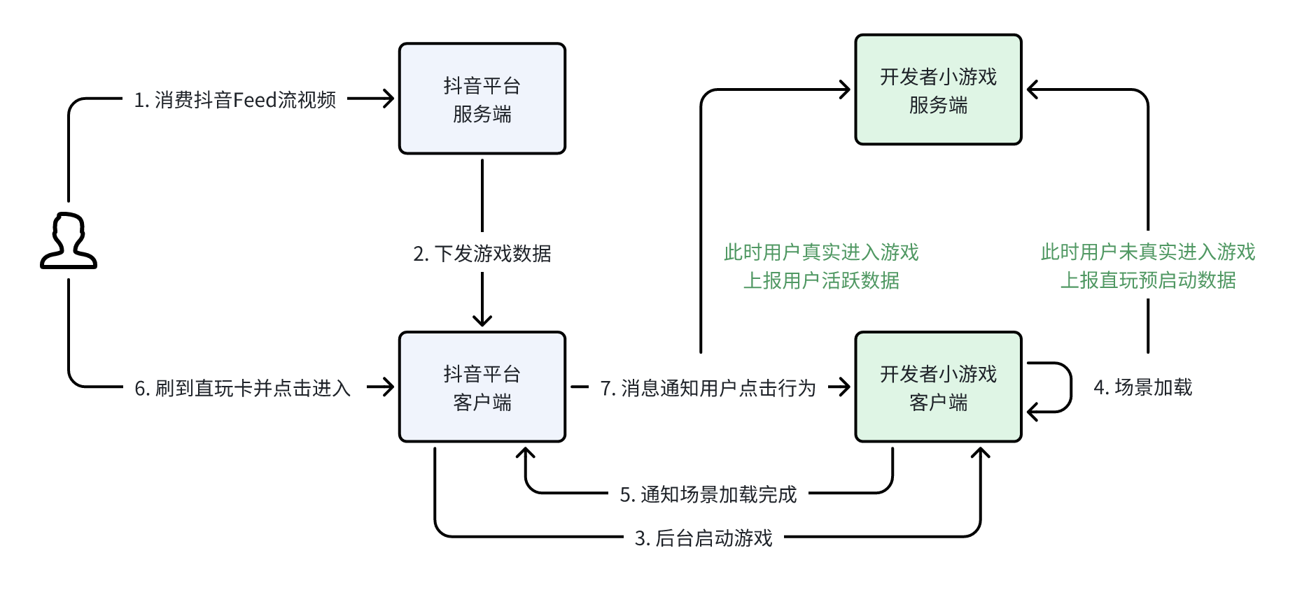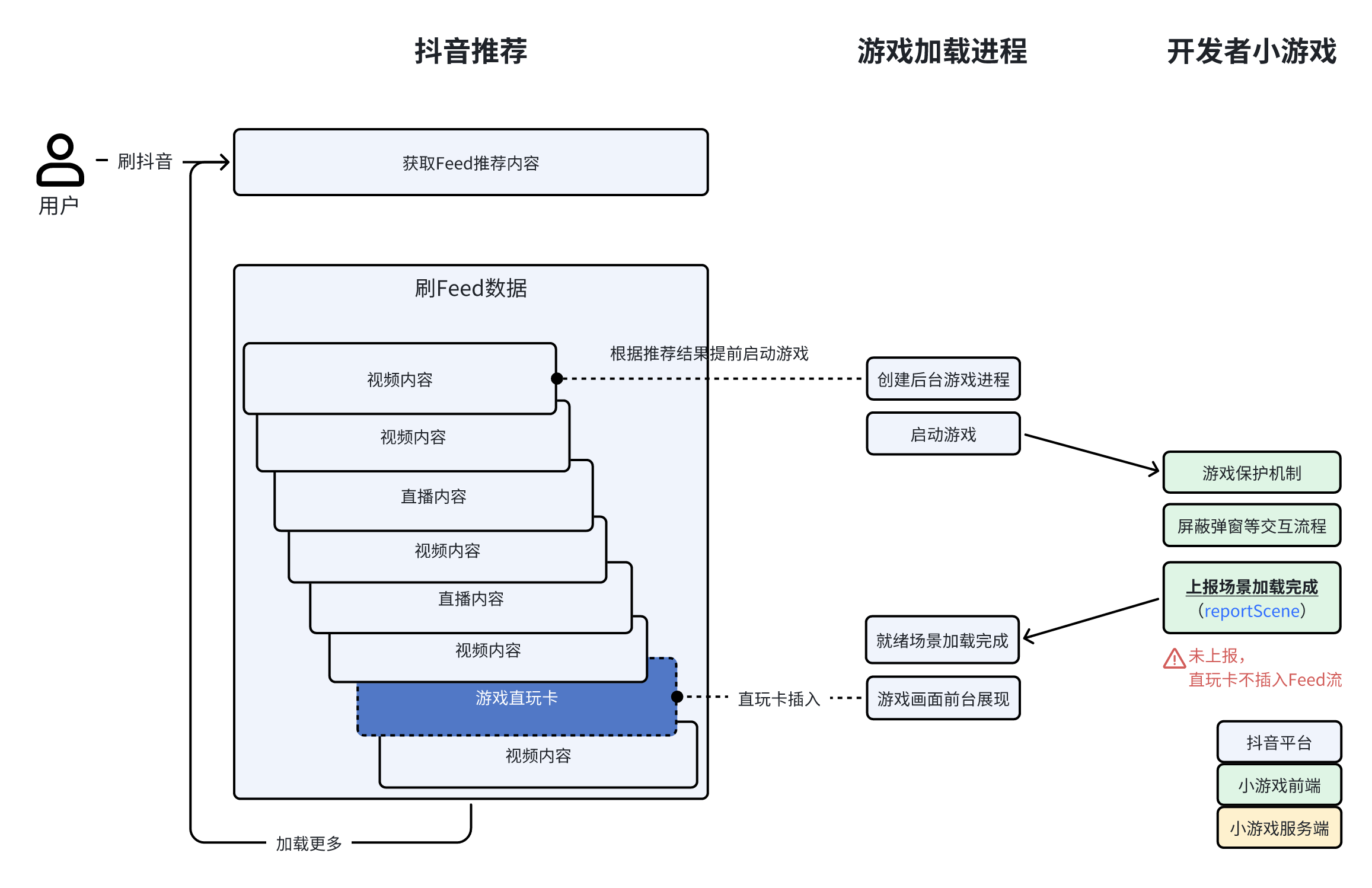 - 2.基于小游戏容器预加载能力,将预加载完成的游戏在推荐流中分发给用户,实现抖音推荐流无缝进入游戏的交互体验。