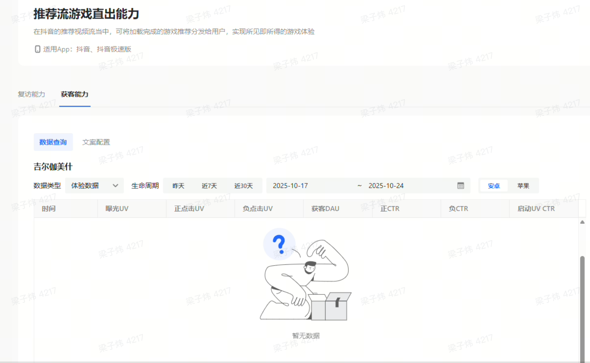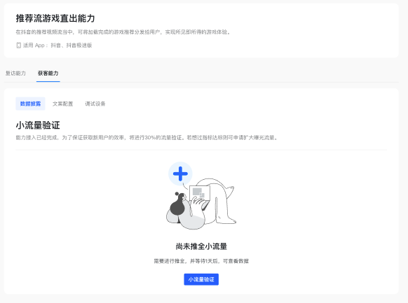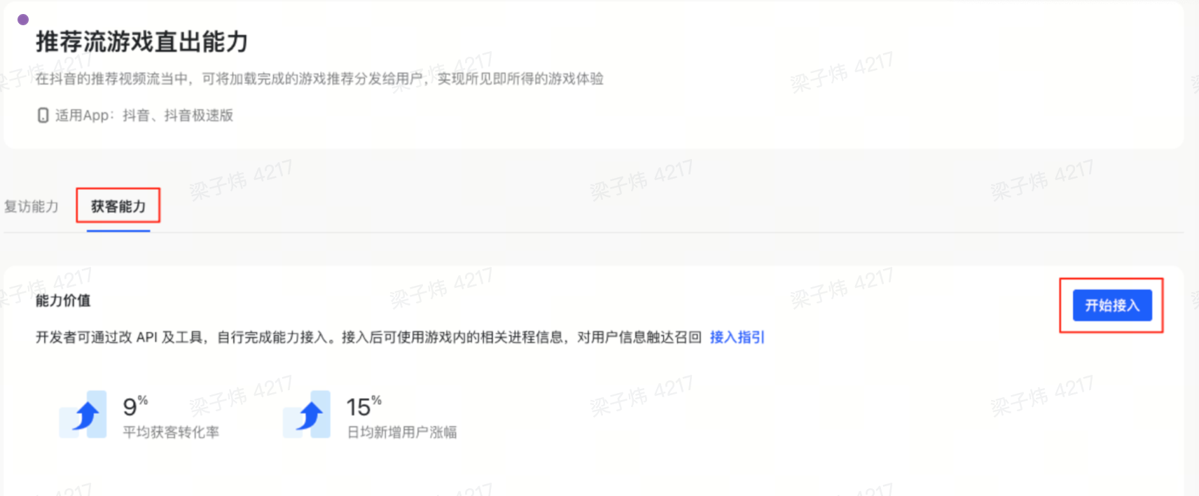 - 1.获客版将抖音大盘用户的游戏偏好数据融入推荐算法,让接入直玩获客的游戏获得更广阔的拉新流量阵地。