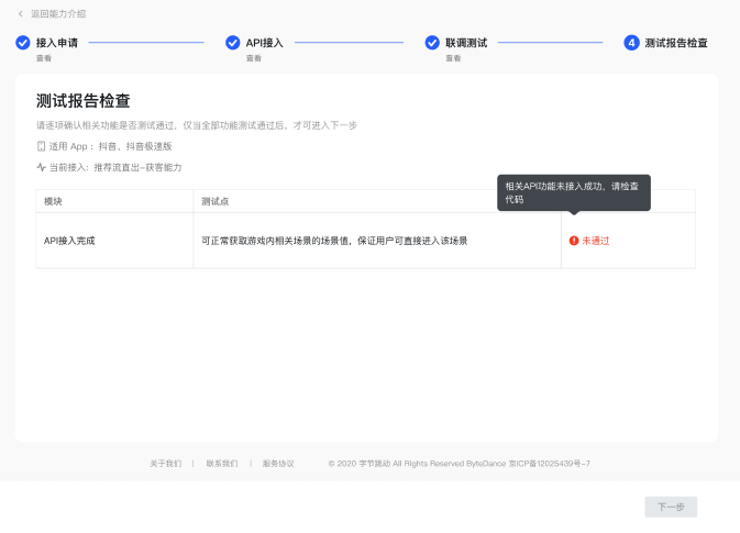 - •接入「上报加载完成时机」API能力,游戏客户端完成对应游戏场景加载完成后,需调用「上报加载完成时机」API 进行加载完成事件上报,否则游戏不会在用户的抖音推荐流中展示。
