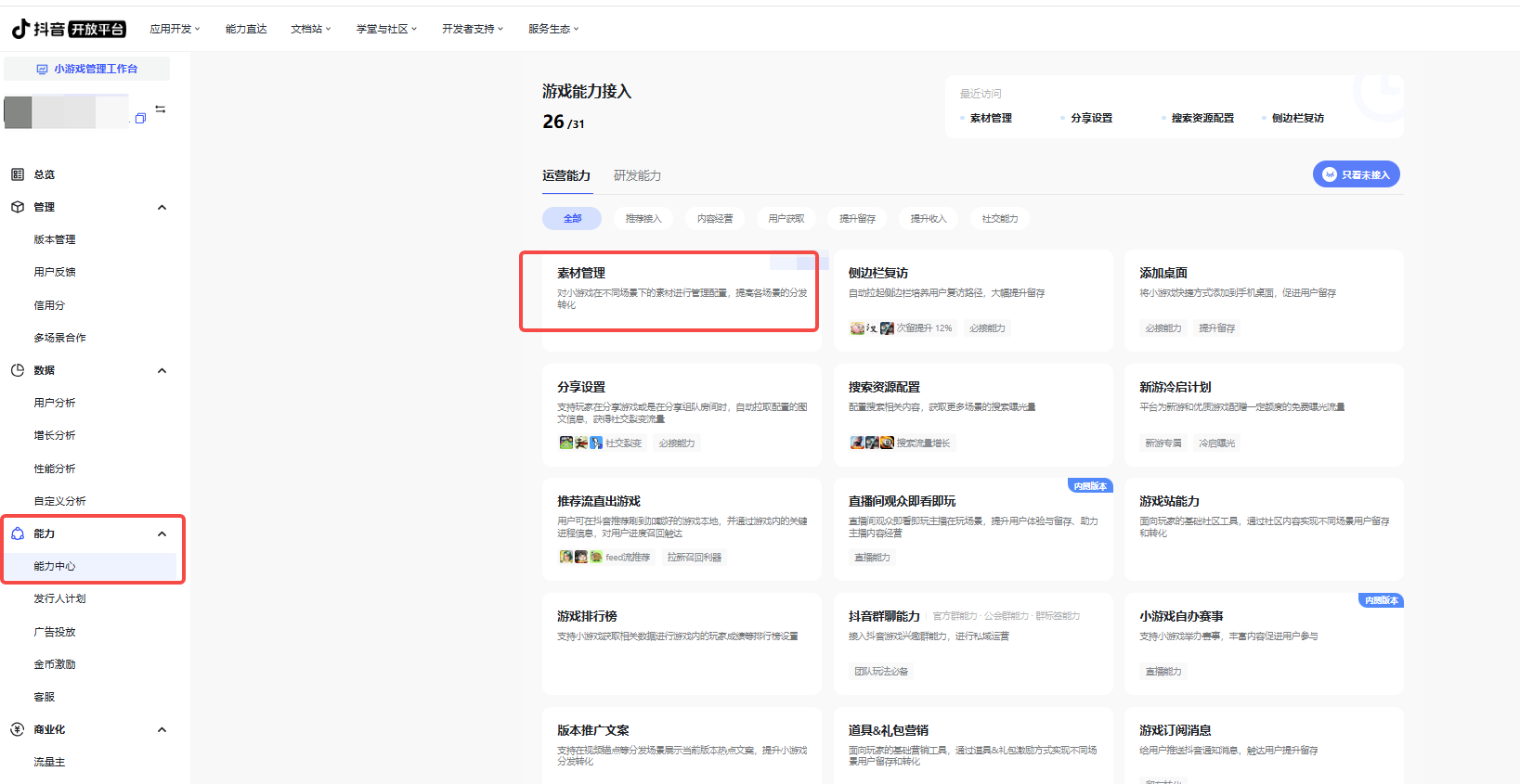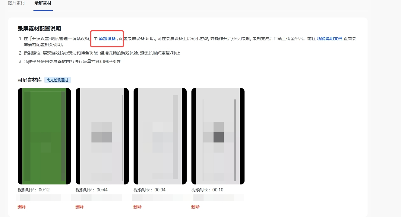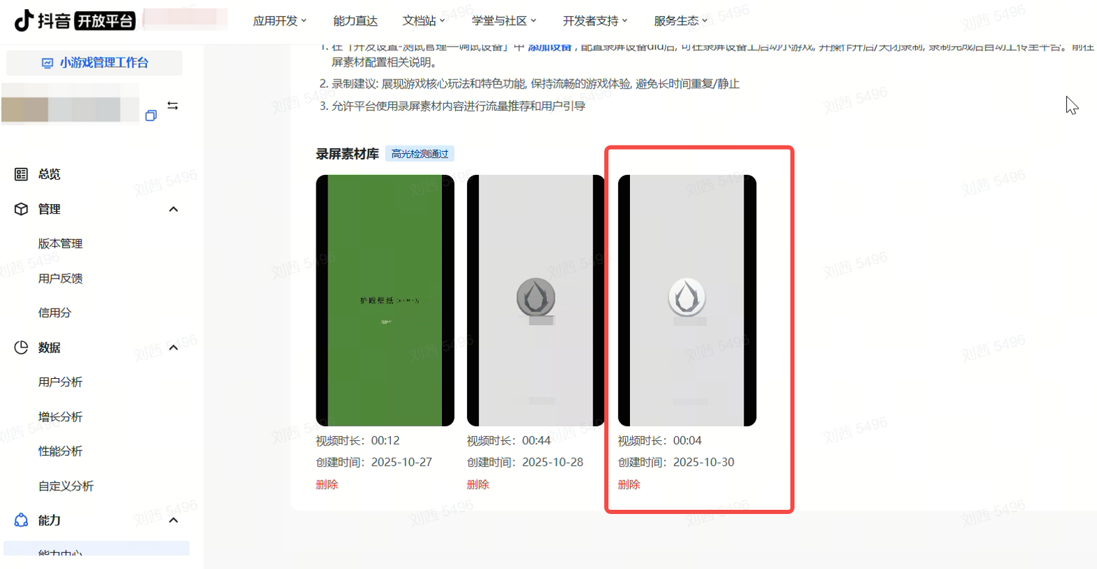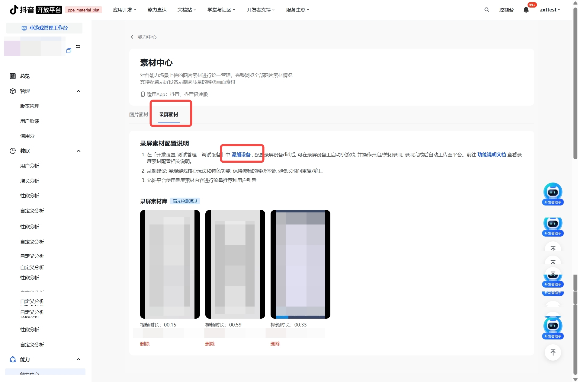 「开放平台」-「能力」-「能力中心」-「素材管理」-「录屏素材」