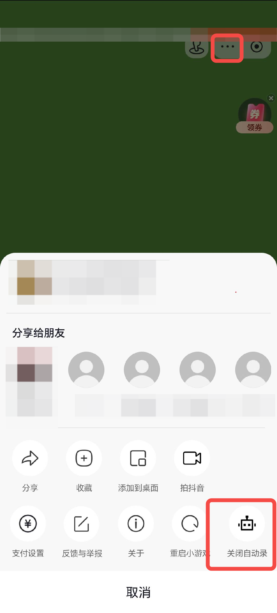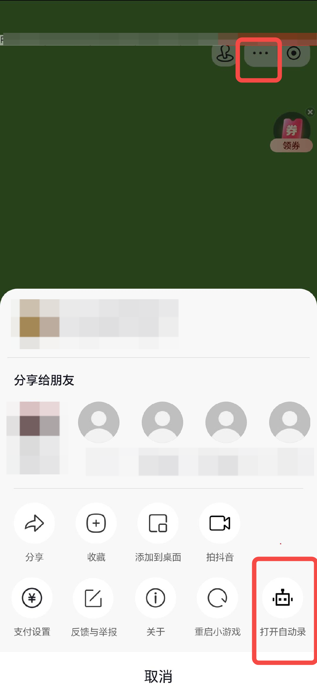 开启高光视频录制 | 图1 图2 图3 | Step 1:测试机打开抖音进入对应小游戏,如图1点击右上角三个点「。。。」-「打开自动录」 【仅支持安卓设备进行素材录制】 Step 2:视频录制完成后,如图2点击右上角三个点「。。。」-「关闭自动录」,如图3视频自动上传 【当前单次录制视频时长不得超过3分钟】 |