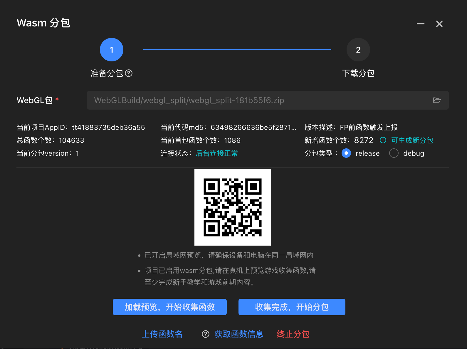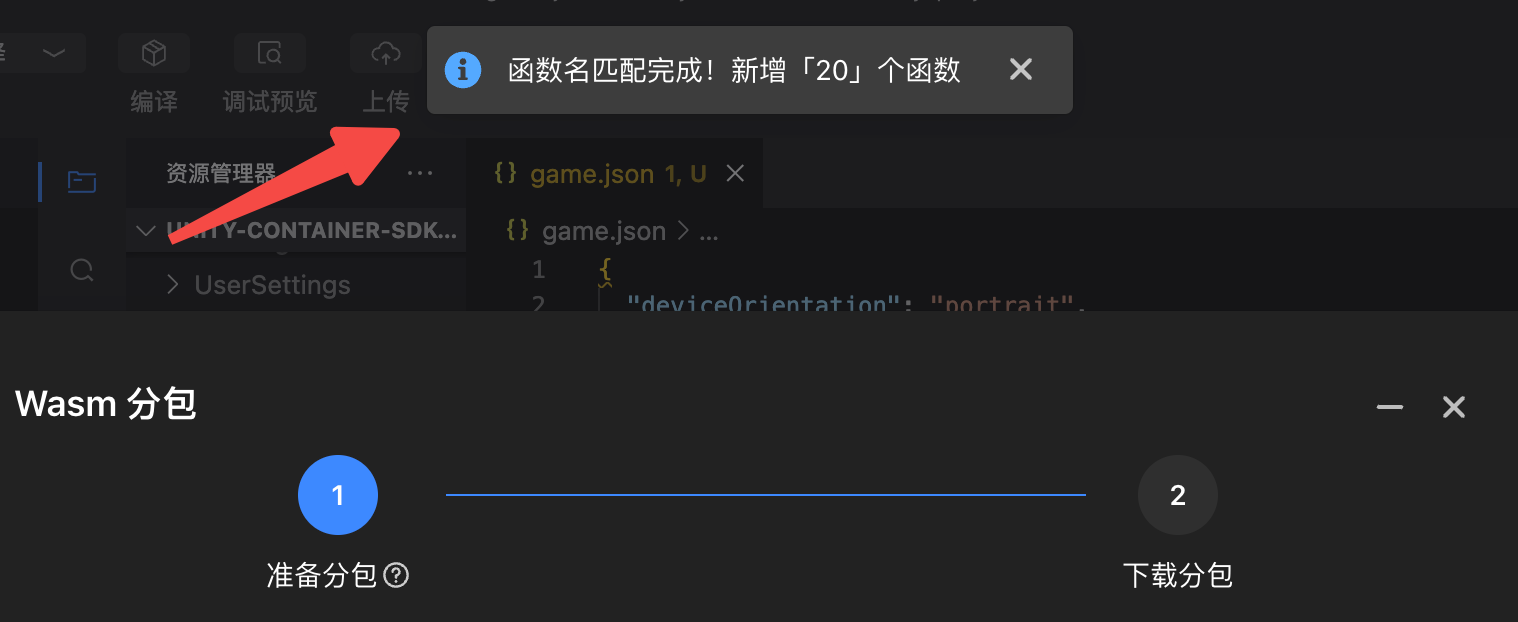 请注意,这个【启用代码分包】并不是做wasm分包,只是为wasm分包前函数收集做准备,你需要收集一些函数后,再点击后续步骤中的【收集完成,开始分包】,才是最终的wasm分包。