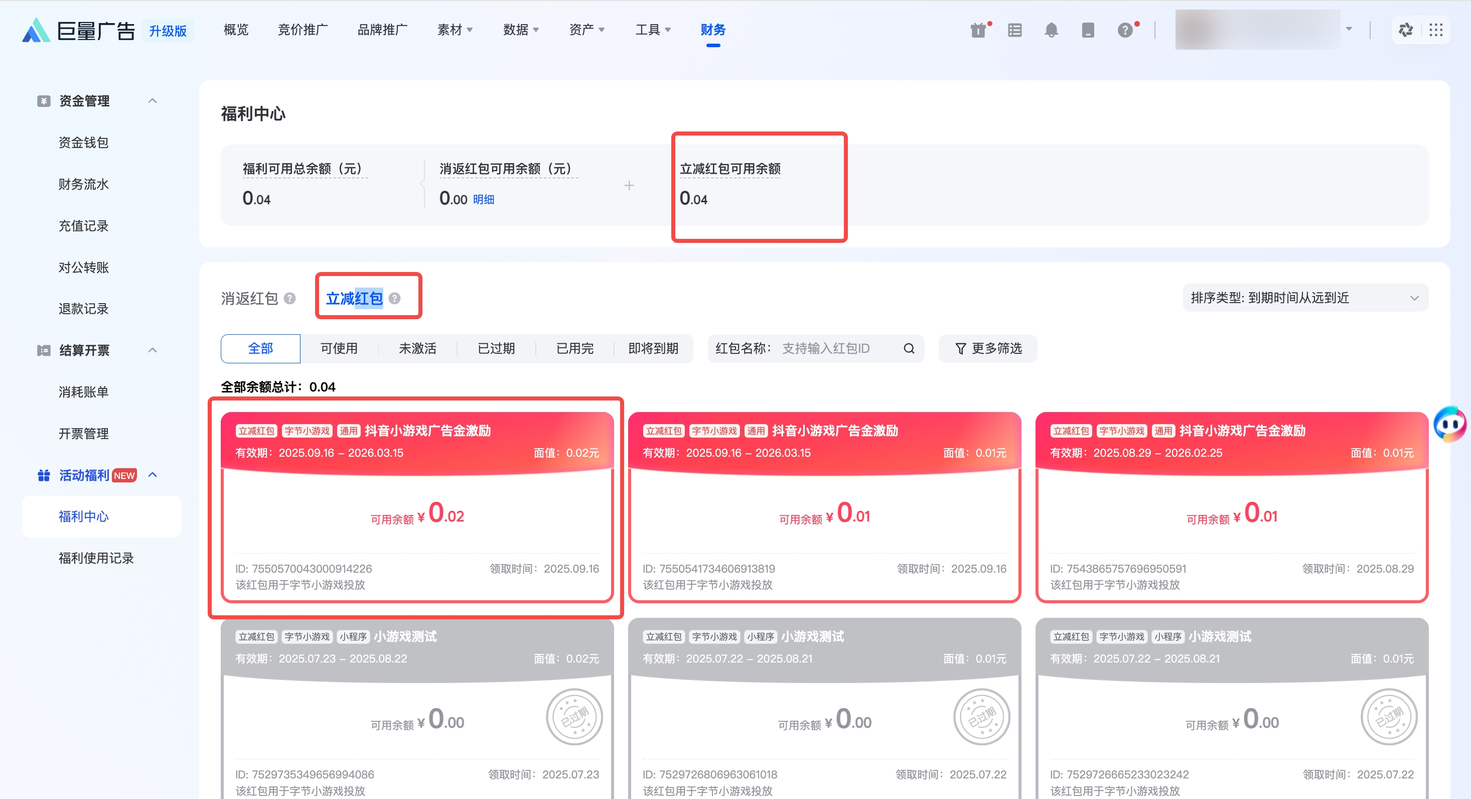 - 3.转充完成后,也可在【巨量引擎投放平台-财务】模块的“活动福利-福利中心-立减红包”查看广告金余额。