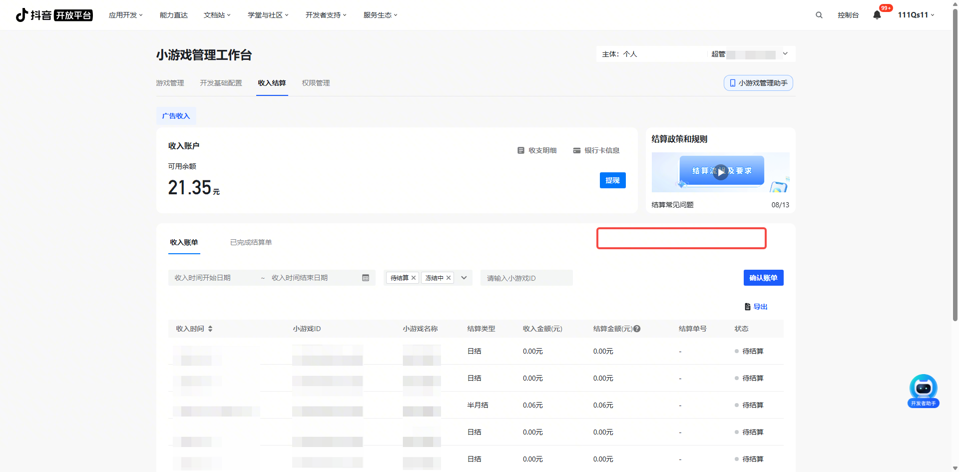 「已完成结算单」→查看明细 | 可查看该笔账单内涉及哪些小游戏和具体周期,以及对应小游戏的入账金额 |