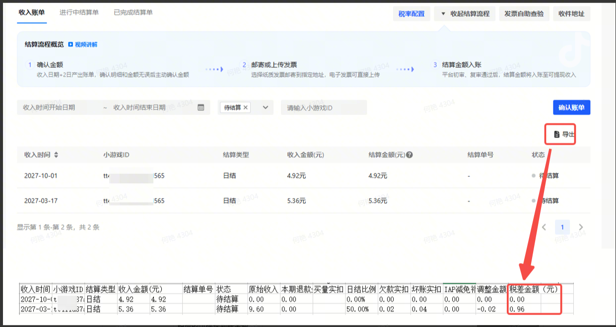 「收入账单」→导出 | 搜索目标小游戏后,导出具体收入明细的字段,可看到各类实扣款项与补贴,用于对账 | |