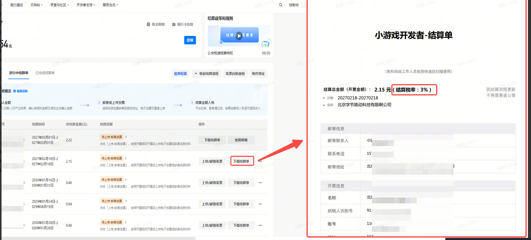 开发者主体 | 结算方式 | 打印邮寄 | 注意 |