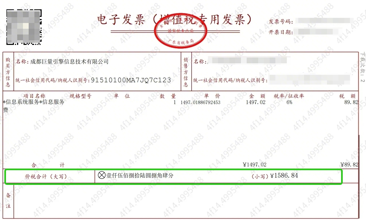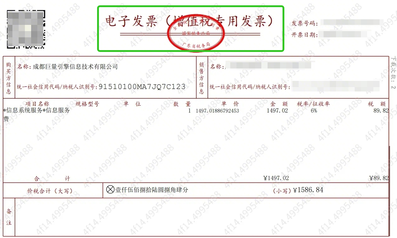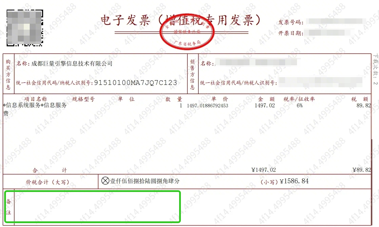 发票备注栏 | 非必填,若填写购方开户银行需为:招商银行成都分行科华路支行 |