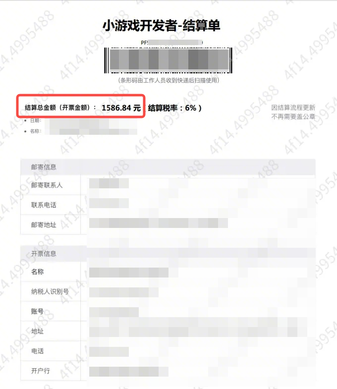 合并开票要求 | ① 同一主体的结算单,满足合同编号、税率、开户行、甲方、乙方信息一致,可以合并开具发票; ② 需附合并开票汇总表,列出结算单号、合同编号、小游戏名称与结算金额;用回形针将对应的结算单、发票、汇总表固定在一起; ③ 无结算门槛限制。 |
