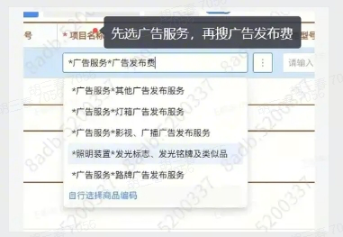 A:分两步搜:先搜前半段(如【广告服务】),再搜后半段(如【广告发布费】)