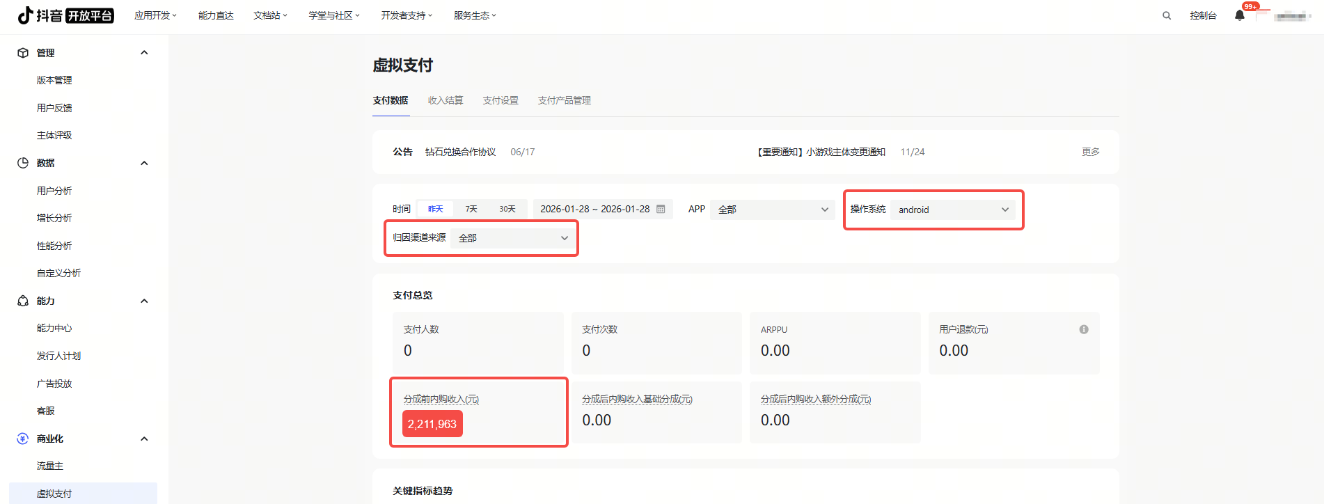 点击对应小游戏的【商业化-虚拟支付-支付数据】。筛选条件中选择对应周期,按照右图1红框位置,记录【分成前内购收入】2,211,963(包含安卓设备下所有的普通支付、钻石支付、担保支付充值流水)